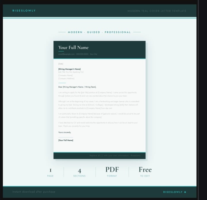 Modern Cover Letter Template for Beginners | Professional Teal Design | First Job Application