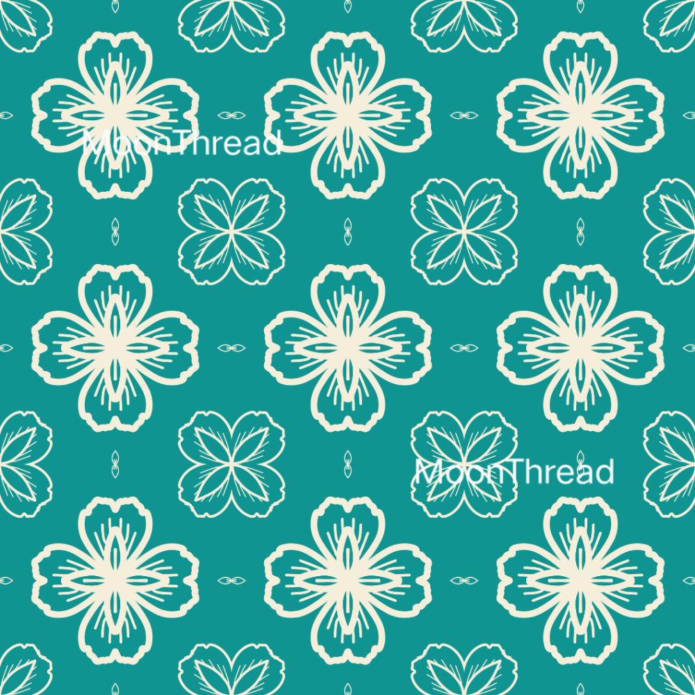 A bold and decorative seamless tile pattern with large floral shapes in soft cream over a deep teal background. This design is perfect for home decor prints, fashion fabrics, surface design projects, wrapping paper, and digital branding backgrounds. The strong symmetry makes it eye-catching and premium looking.