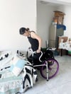 Zoe keeps her numb legs active with massage and practices standing with a walker.