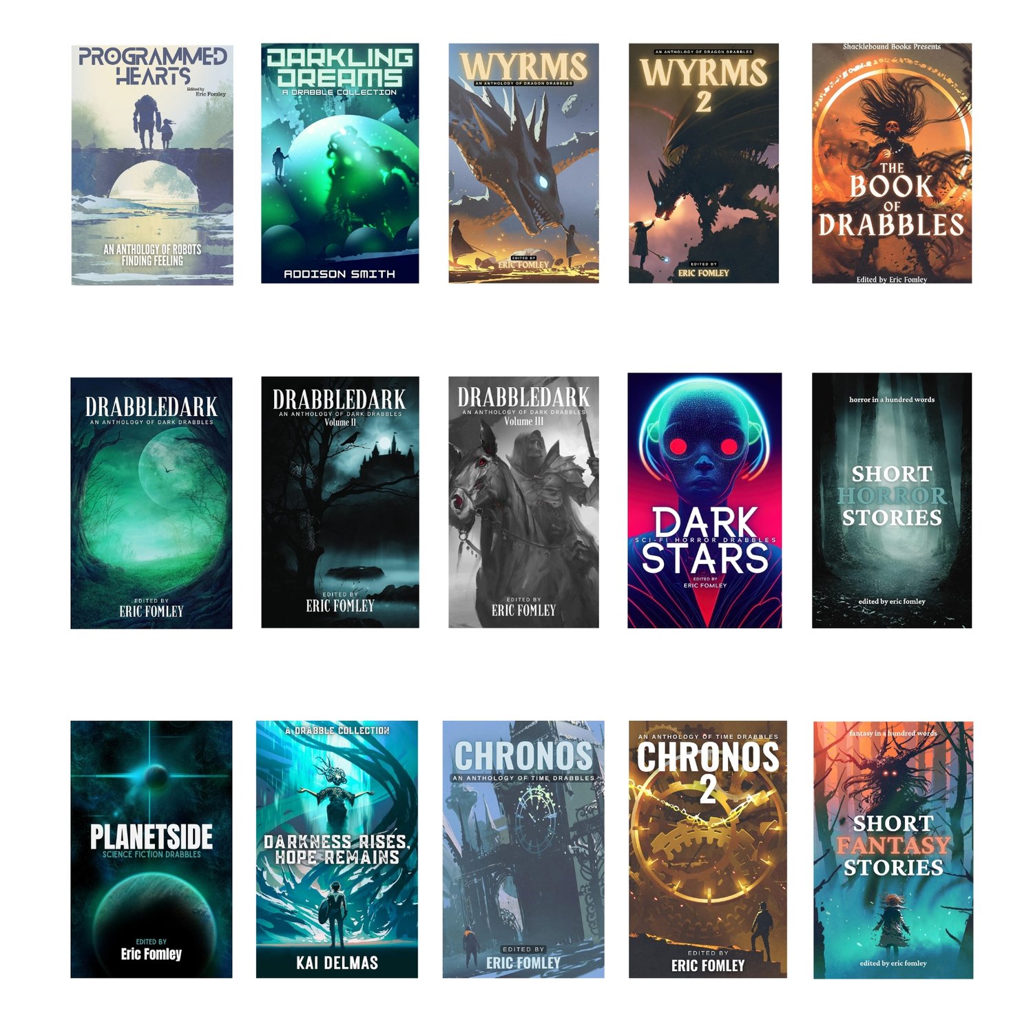 Programmed Hearts, Darkling Dreams, Wyrms, Wyrms 2, The Book of Drabbles, Drabbledark, Drabbledark II, Drabbledark III, Dark Stars, Short Horror Stories, Planetside, Darkness Rises, Hope Remains, Chronos, Chronos 2, and Short Fantasy Stories.