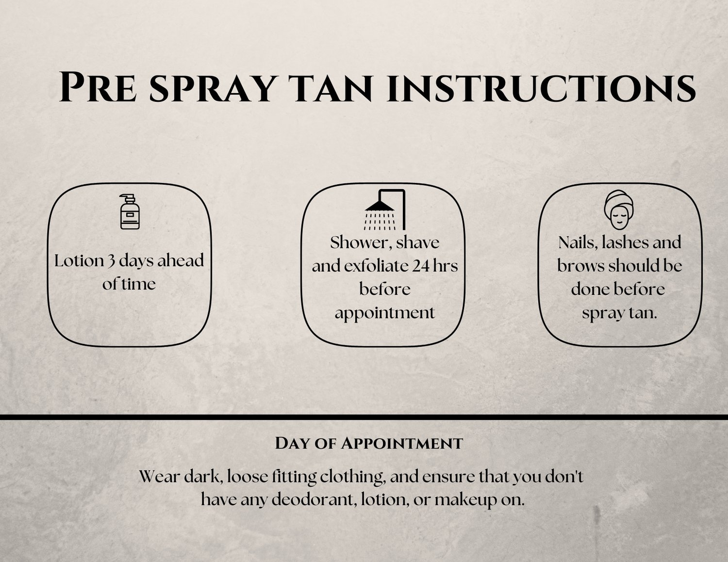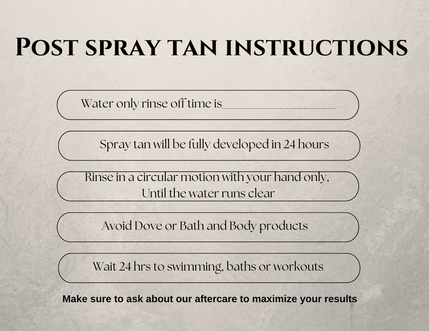 This digital download includes pre- and post-spray tanning care instructions, designed to help your clients achieve the best results. It also features a customizable section to write down their rinse off time. Perfectly sized to print as a postcard, this product is both practical and professional ideal for client handouts or display in your tanning studio.