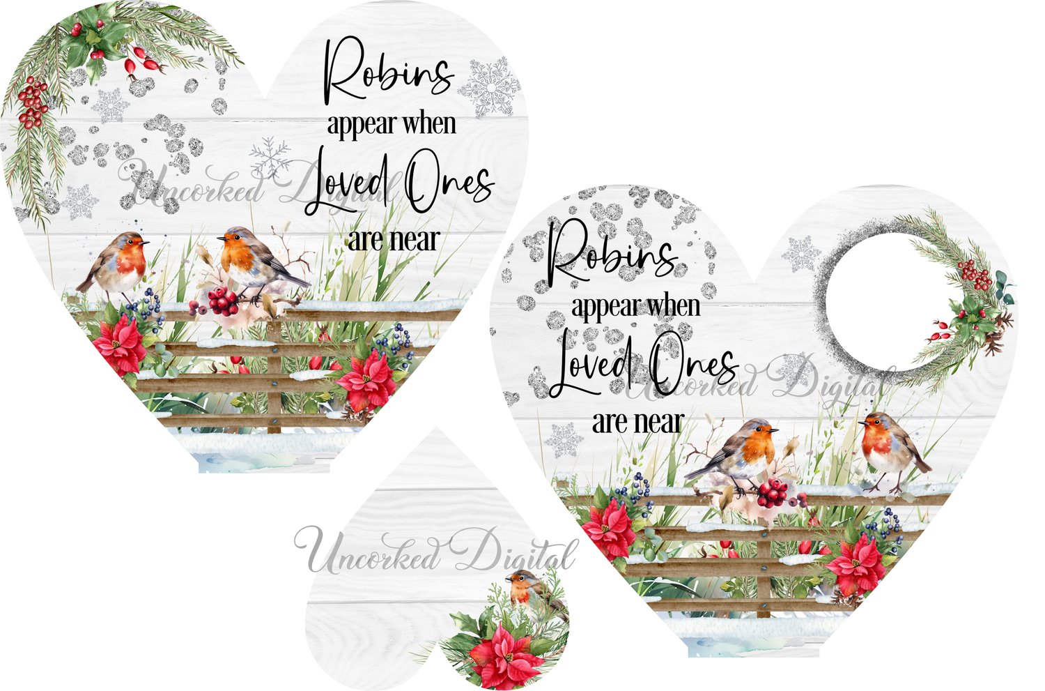 Robins appear heart with heart base design, with and without photo space (woodform)