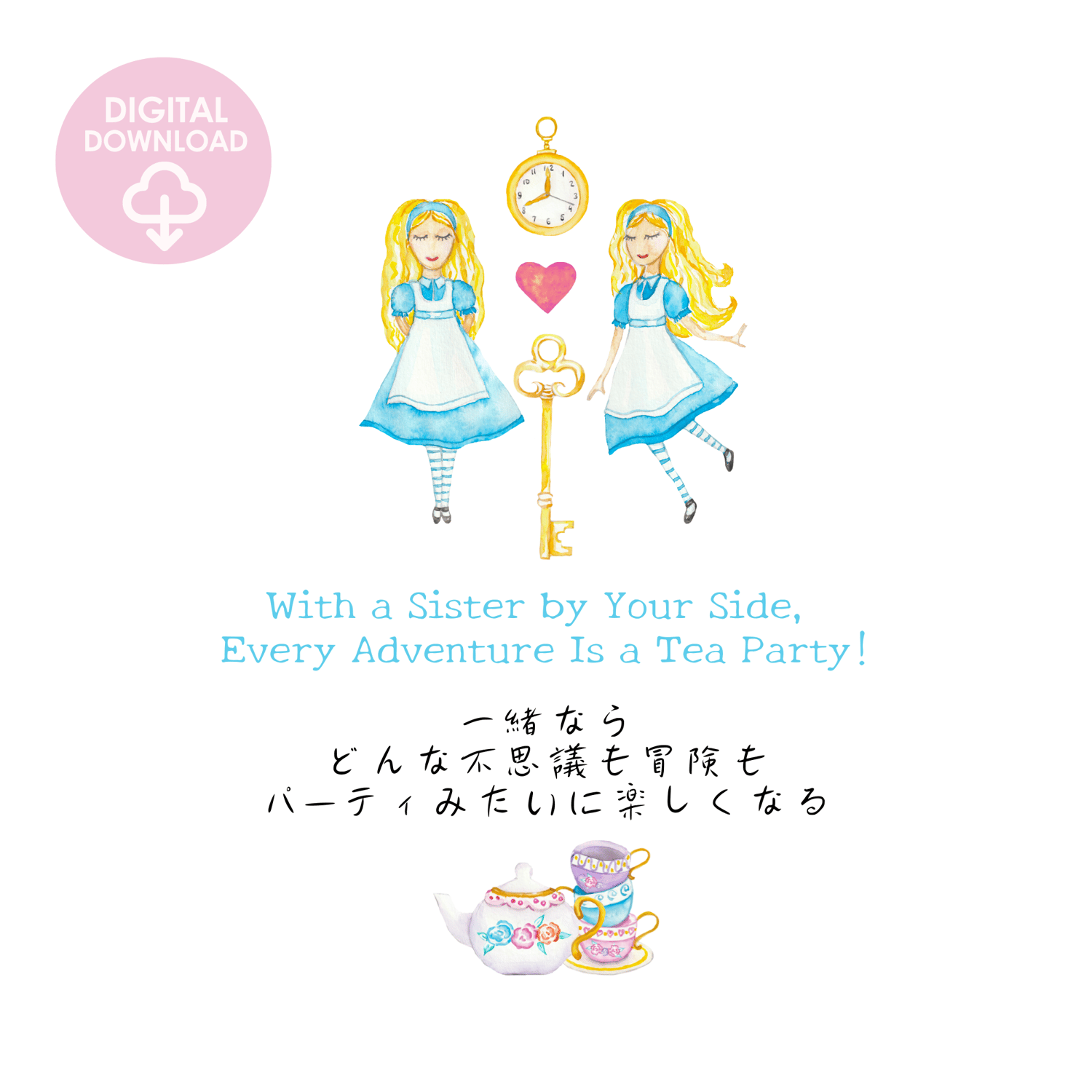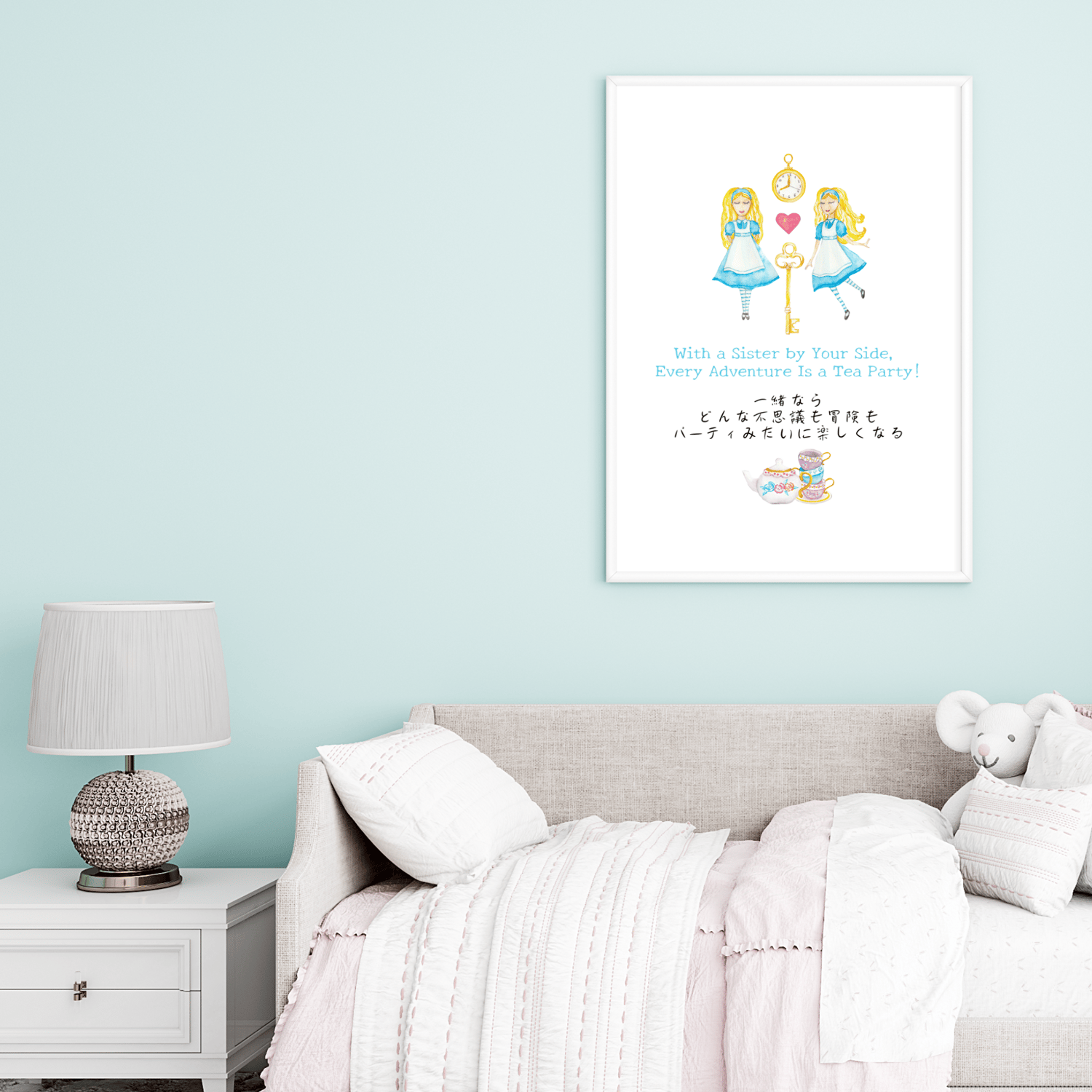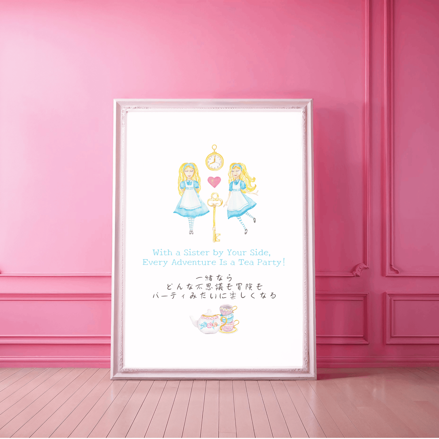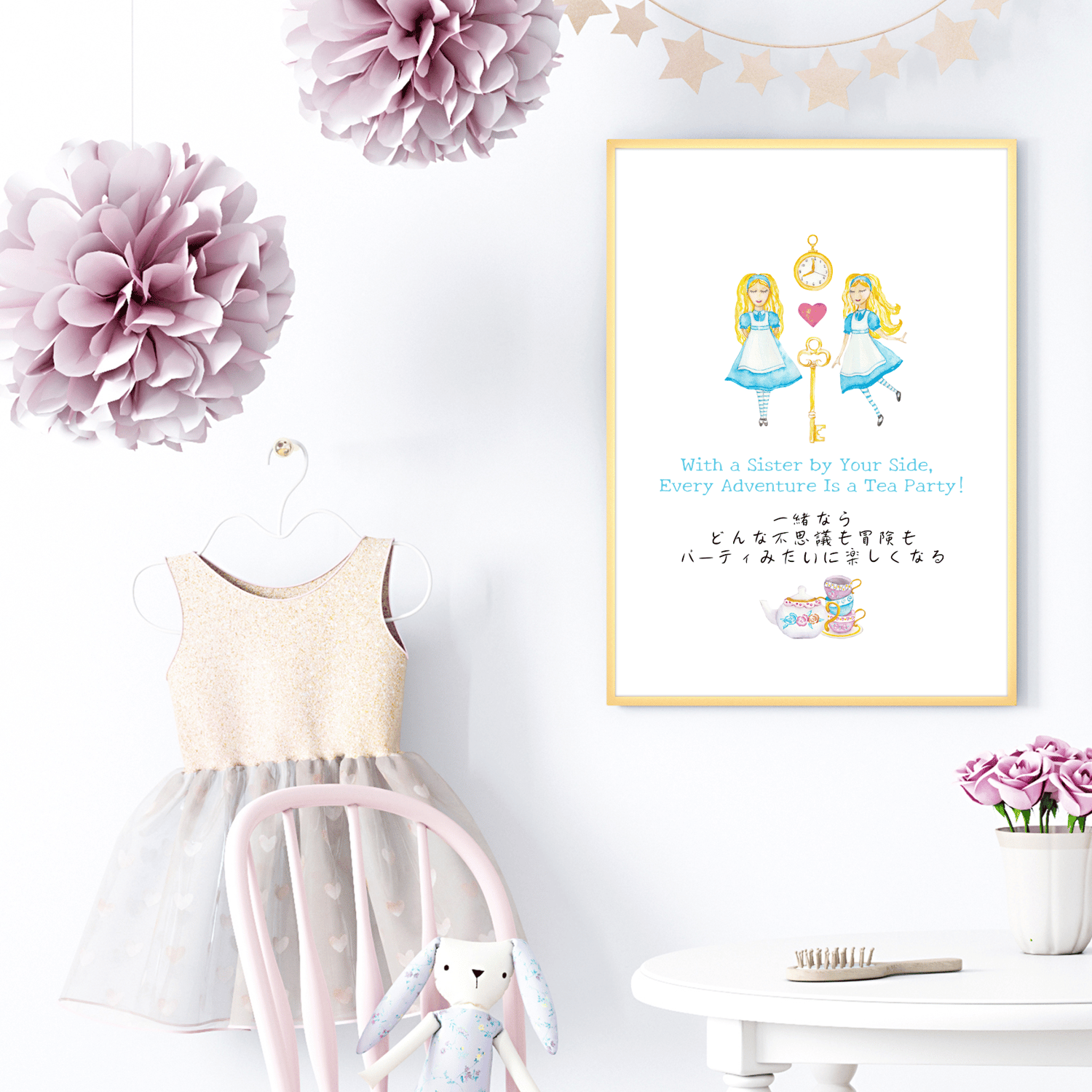 Celebrate the magic of sisterhood with my whimsical Alice in Wonderland-themed wall art. This digital piece showcases two sweet sisters in a watercolor design, complete with heartwarming quotes in English and Japanese. Perfect for any girls' room or nursery, this printable art brings a touch of enchantment and love.