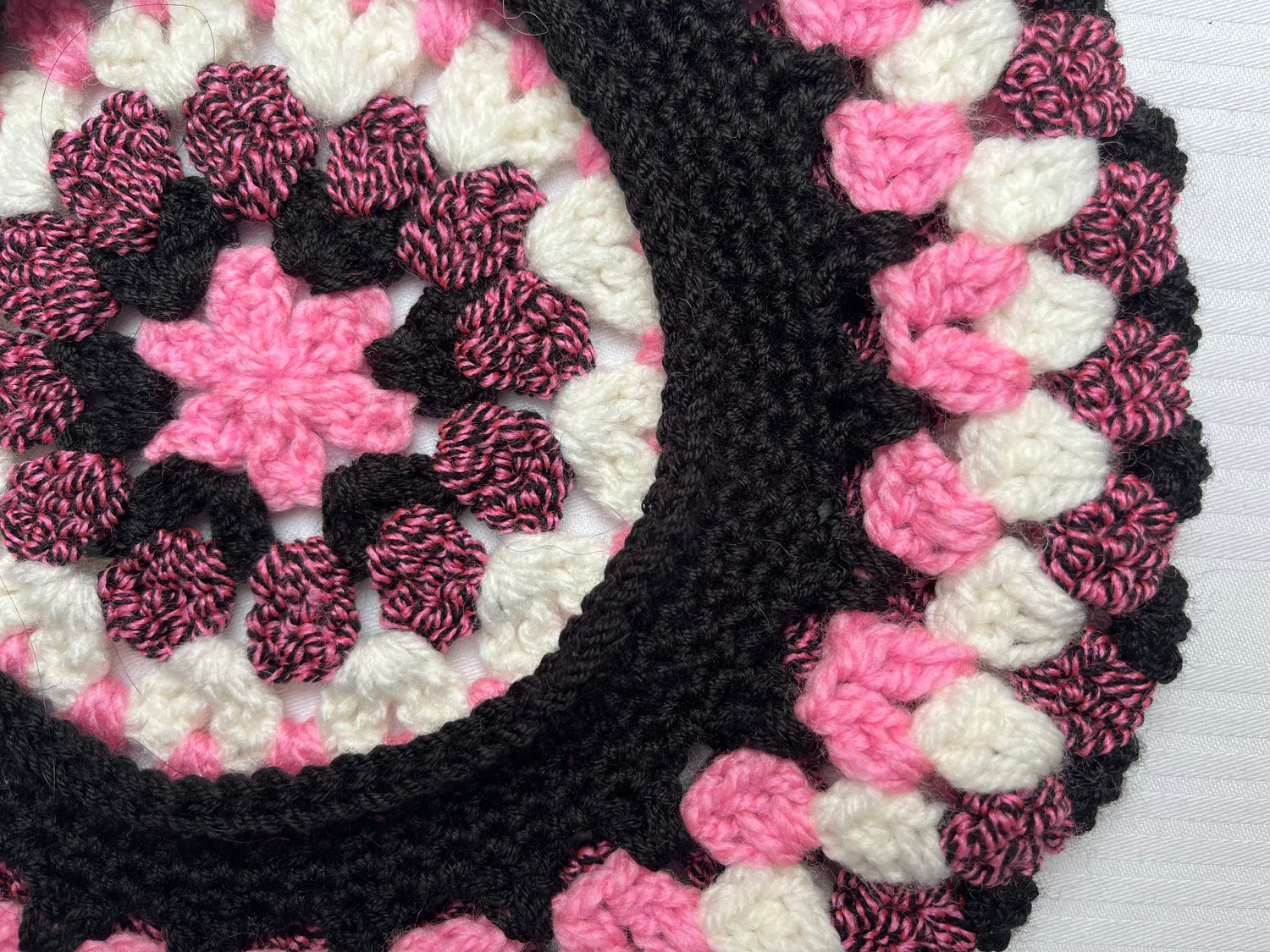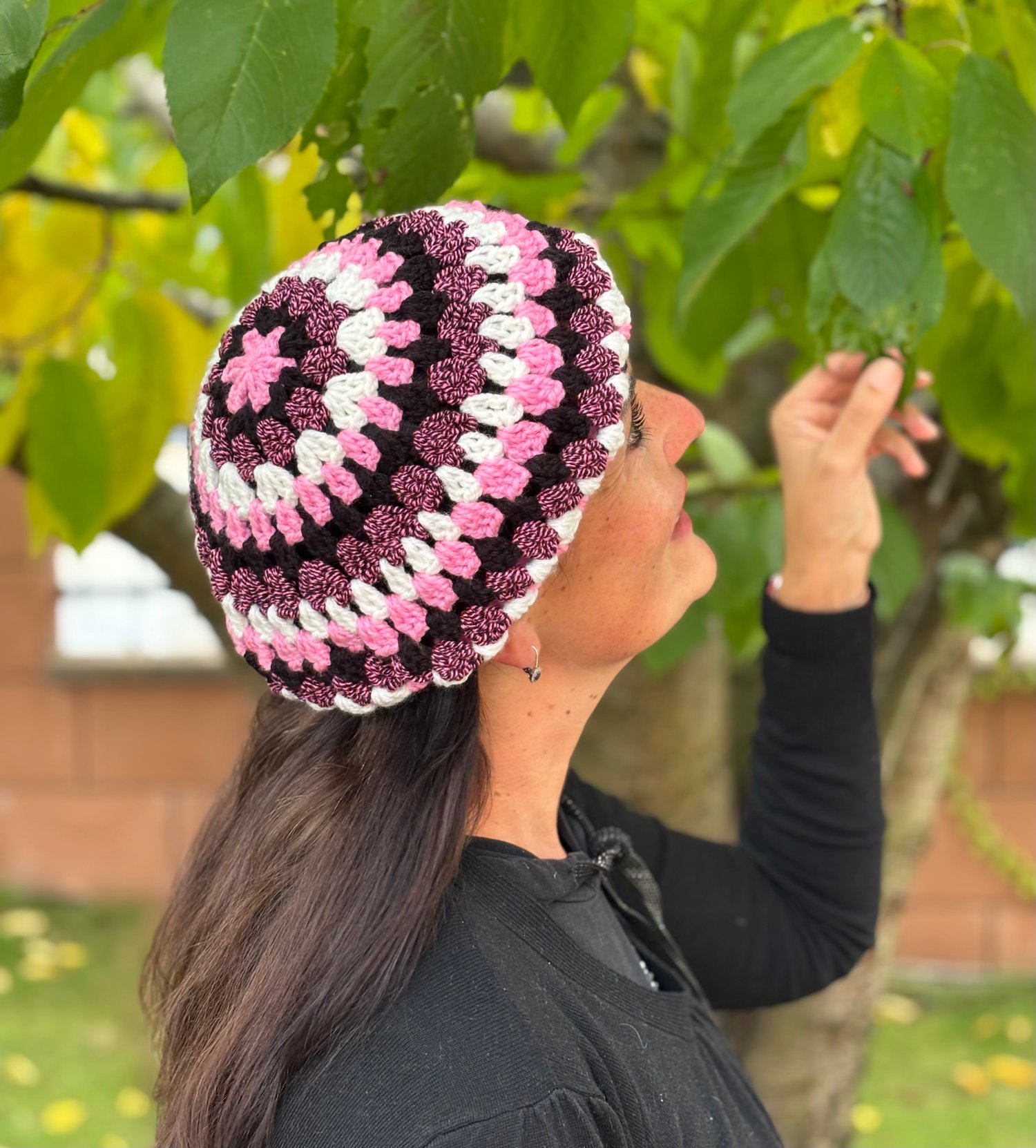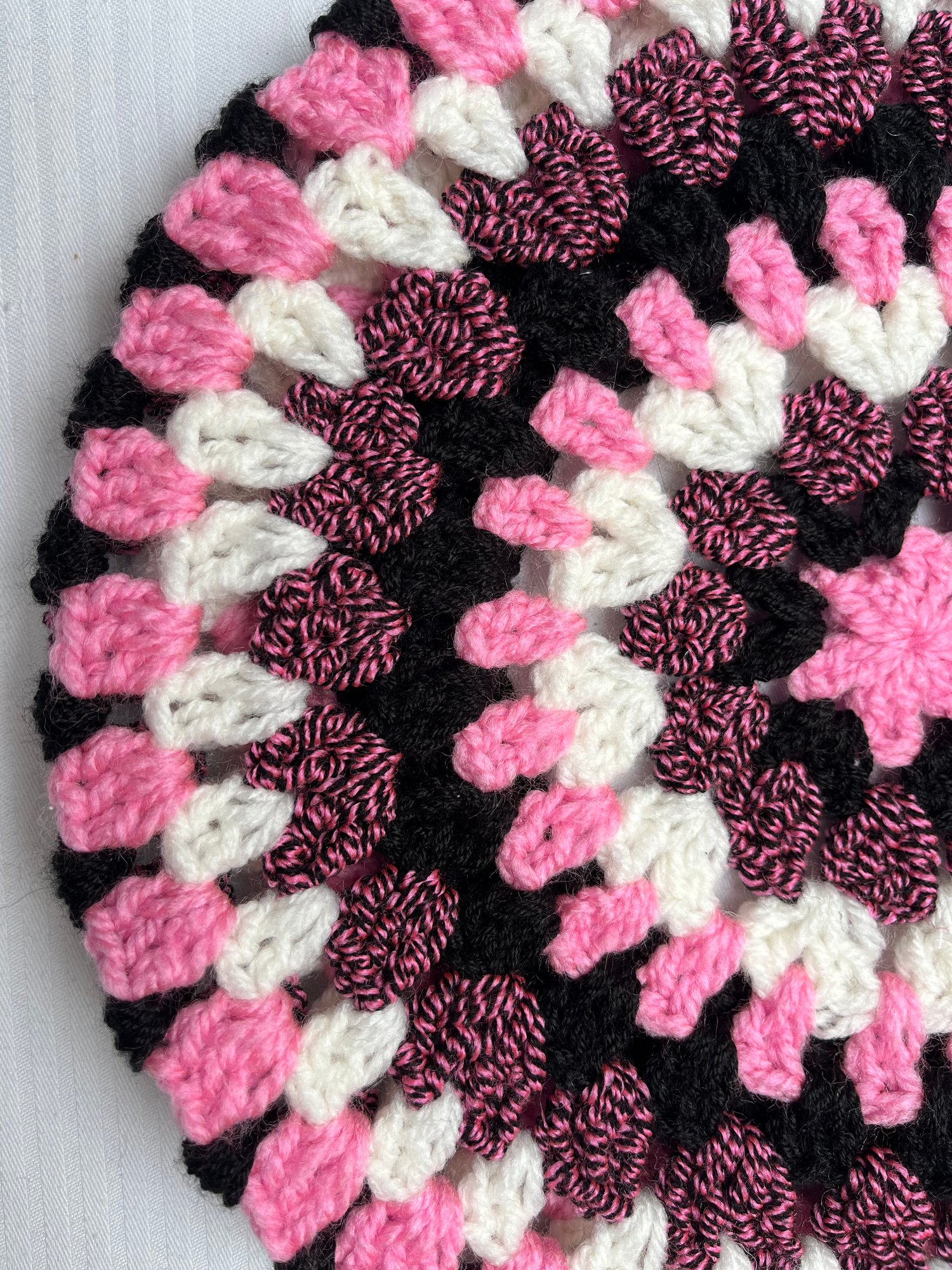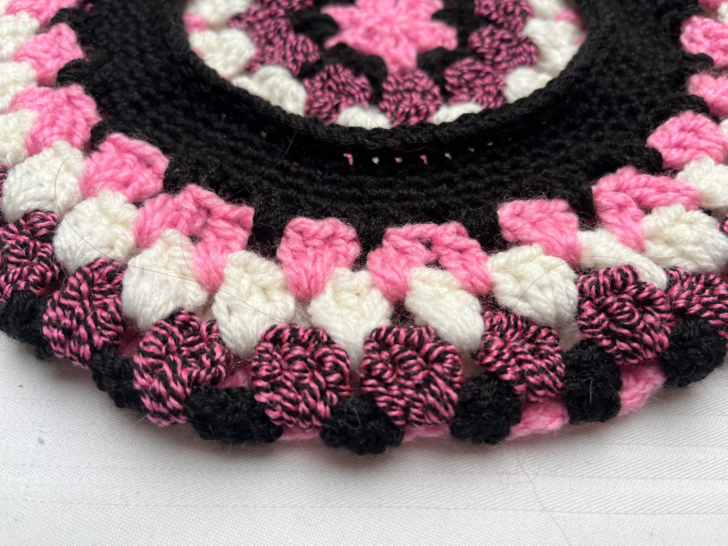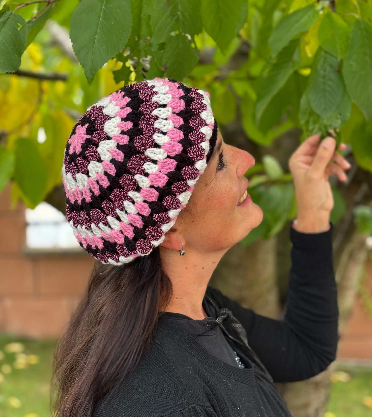 Háčkování probíhá shora dolů v uzavřených kruhových řadách, což zajišťuje hladký a pravidelný tvar. I když se jedná o jednoduchý vzor, střídáním barev (např. růžové, černé a bílé) docílíte zářivého a jedinečného vzhledu, který skvěle doplní jakýkoliv outfit.