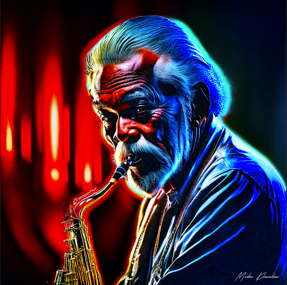 "Morten Klementsen's latest digital masterpiece, 'BLU BLUE BLUES -Blues Ecstasy,' is a captivating exploration of the raw, emotive power of the blues. Inspired by the legendary travels and performances of the fictional Clark Gabriel and his BLU BLUE BLUES Band, this work effortlessly captures the very essence of the genre – a soulful, immersive journey through the depths of human experience. Klementsen's bold, expressive brushstrokes and vibrant color palette merge to create a composition that is both visually stunning and profoundly moving, inviting the viewer to feel the same sense of unwavering passion and artistic integrity that defines the uncompromising spirit of the blues."
