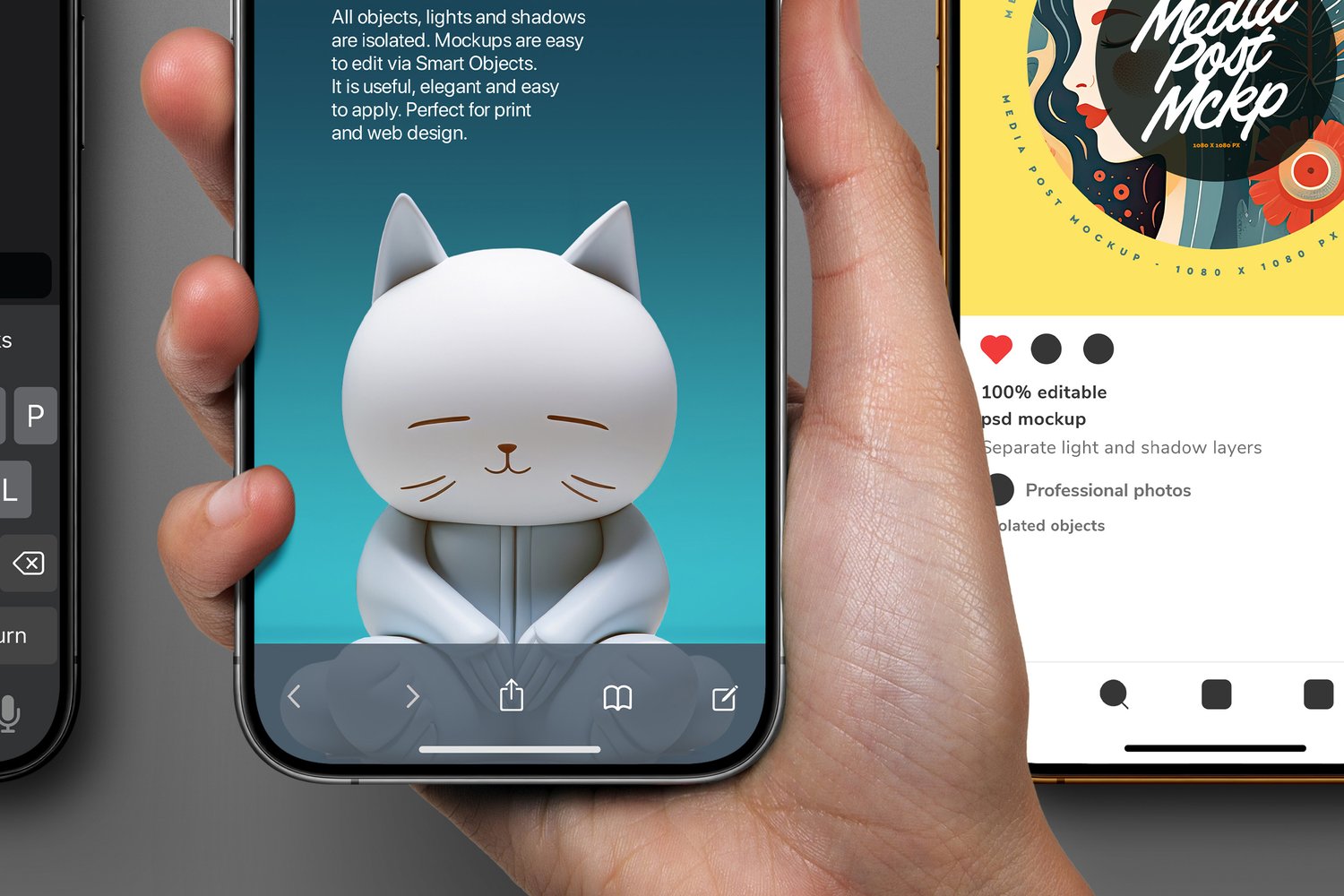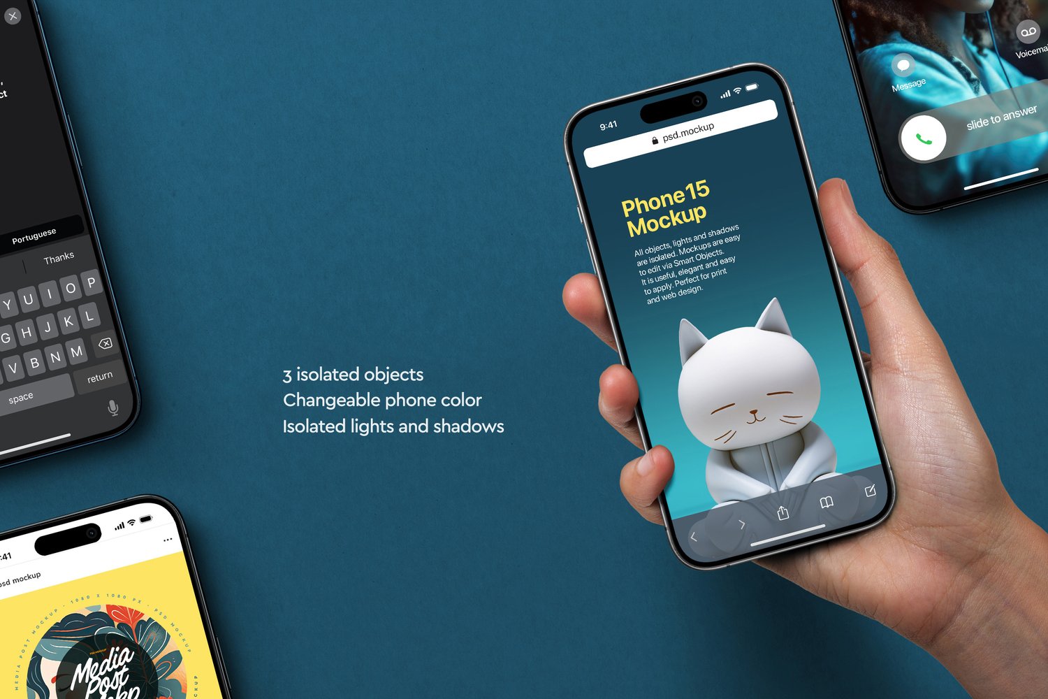 Photorealistic iPhone 15 mockup pack with three hand-holding and flat-lay scenes, editable lights & shadows and Smart-Object layers.