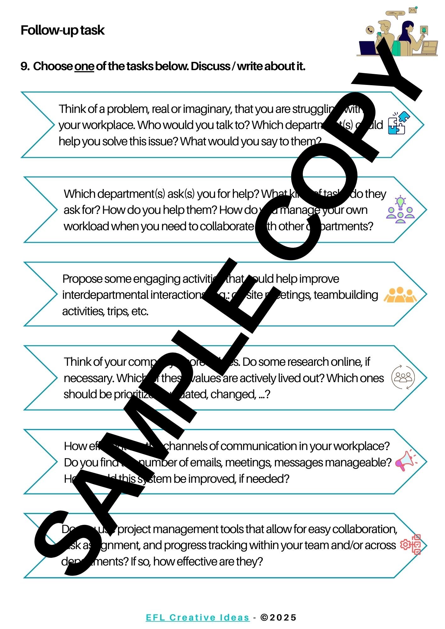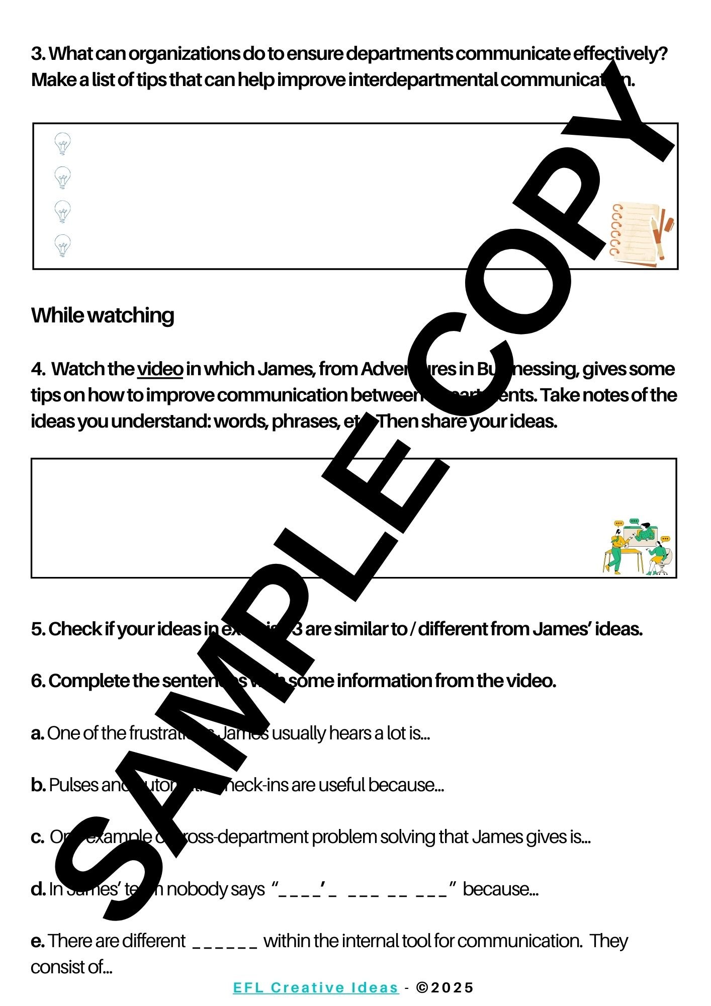 In this lesson students will talk about communication in the workplace. They will express their own experiences and feelings about the topic. They will also make some predictions before watching a video by suggesting their own tips to improve interdepartmental communication.