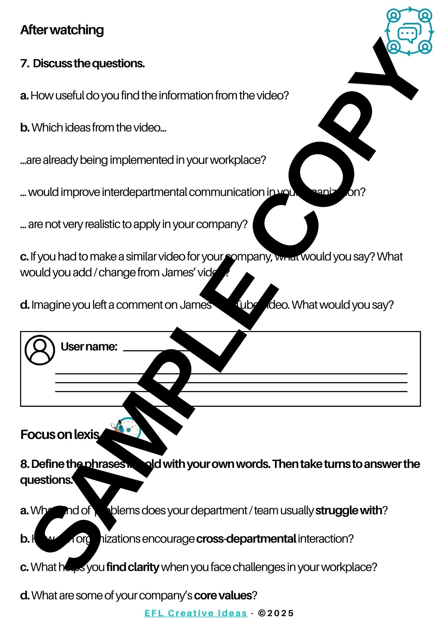 After watching, students will express opinions and reactions towards the video and the topic while relating it to their pwn business contexts.