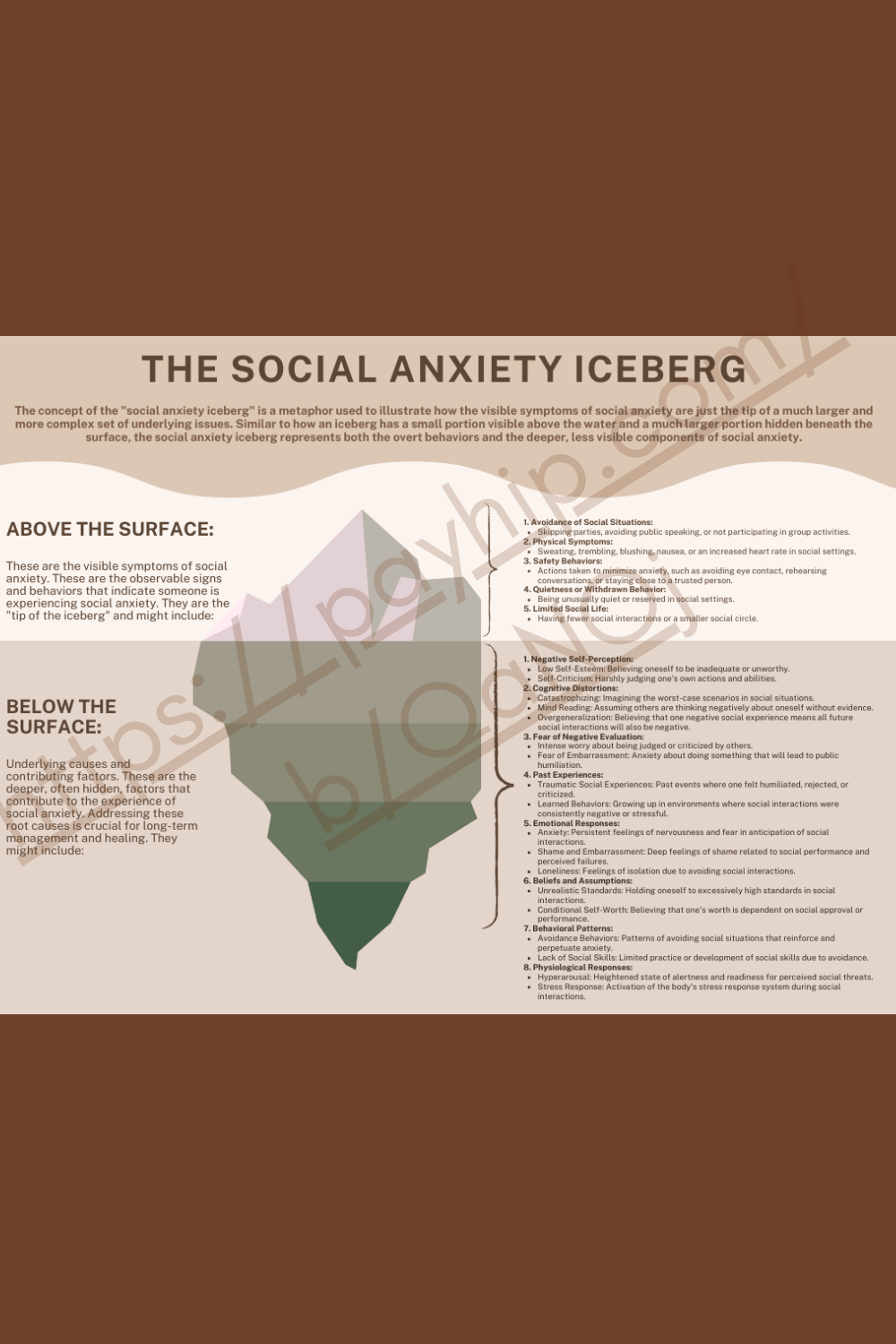 This worksheet highlights the concept of the "social anxiety iceberg", a metaphor used to illustrate how the visible symptoms of social anxiety are just the tip of a much larger and more complex set of underlying issues. Similar to how an iceberg has a small portion visible above the water and a much larger portion hidden beneath the surface, the social anxiety iceberg represents both the overt behaviors and the deeper, less visible components of social anxiety.