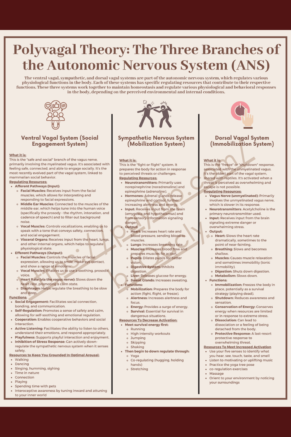 This worksheet highlights the three branches of the autonomic nervous system (ANS). The ventral vagal, sympathetic, and dorsal vagal systems are part of the autonomic nervous system, which regulates various physiological functions in the body. Each of these systems has specific regulating resources that contribute to their respective functions. These three systems work together to maintain homeostasis and regulate various physiological and behavioral responses in the body, depending on the perceived environmental and internal conditions.