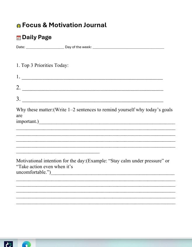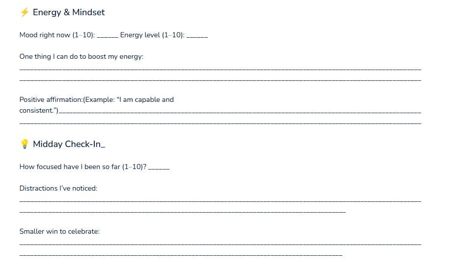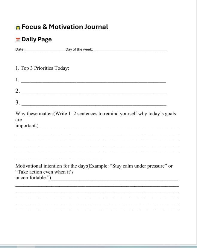 This document is a structured daily and weekly journal designed to help individuals prioritize tasks, track energy and mindset, monitor focus and distractions, reflect on accomplishments and challenges, and set intentions for the following day and week. It includes sections for listing top priorities, motivational intentions, mood and energy levels, midday check-ins, evening reflections, and weekly summaries of highlights, challenges, and motivation sources.