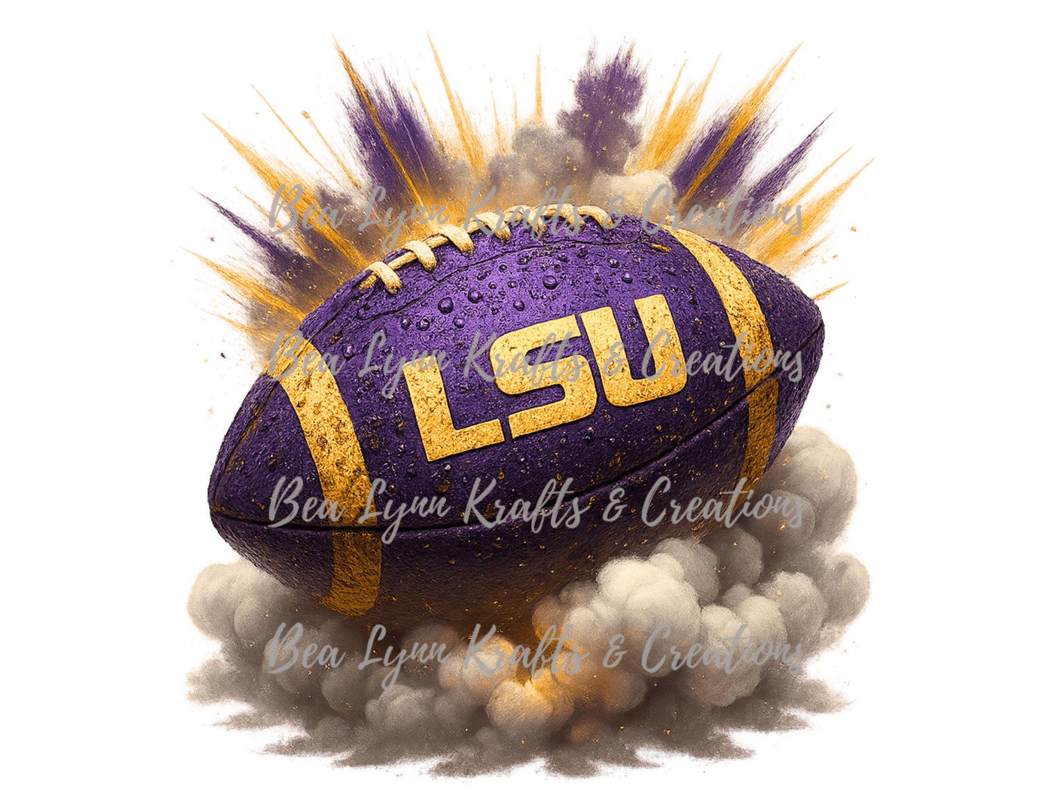 GEAUX TIGERS! This LSU Tigers transparent PNG delivers a jaw-dropping explosion of purple and gold power. A highly detailed football—soaked in realism with water droplets, game-day grit, and the official LSU logo—erupts from a thunderous cloud of smoke. Backed by blazing gold and electric purple burst effects, this design captures the raw intensity of SEC Saturdays. Whether you're tailgating in Baton Rouge or selling online, this artwork brings Louisiana pride and stadium heat right into your product lineup.