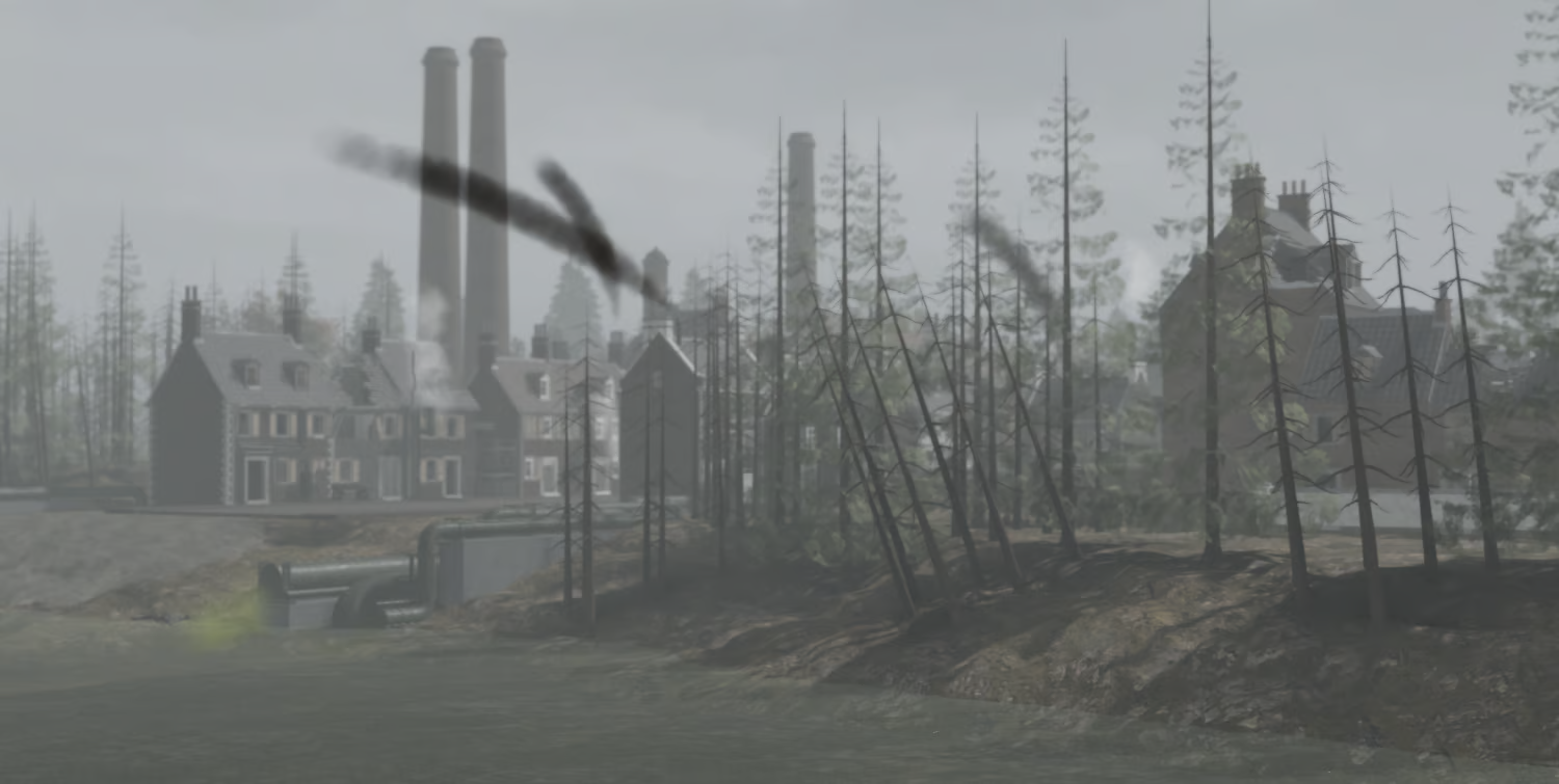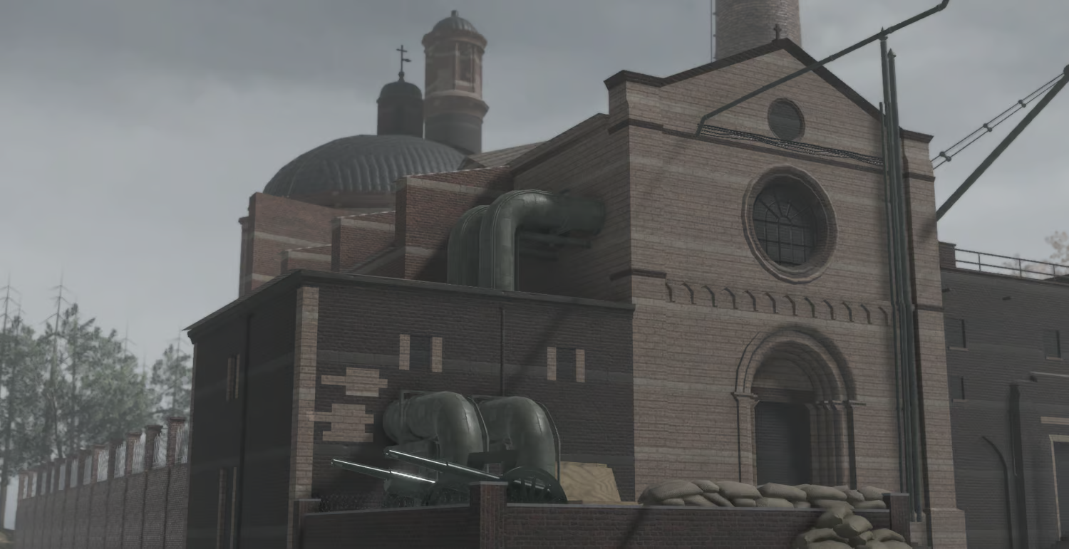 Ruthenian Frontier is an industrial town set in 1920's, designed with a heavily fortified layout. The town features large factories, military bunkers, and extensive fencing, creating a strong defensive presence. The surrounding area is heavily scarred by war, with craters, debris, and chemical-tainted water scattered across the landscape.