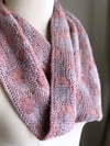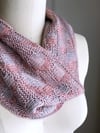 Inspired by the cratered lunar landscape, this cowl combines double knitting and double-stranded (“marled”) garter stitch to create a reversible fabric featuring circles & crescents in varying sizes. Both written instructions and charts are included in the pattern.