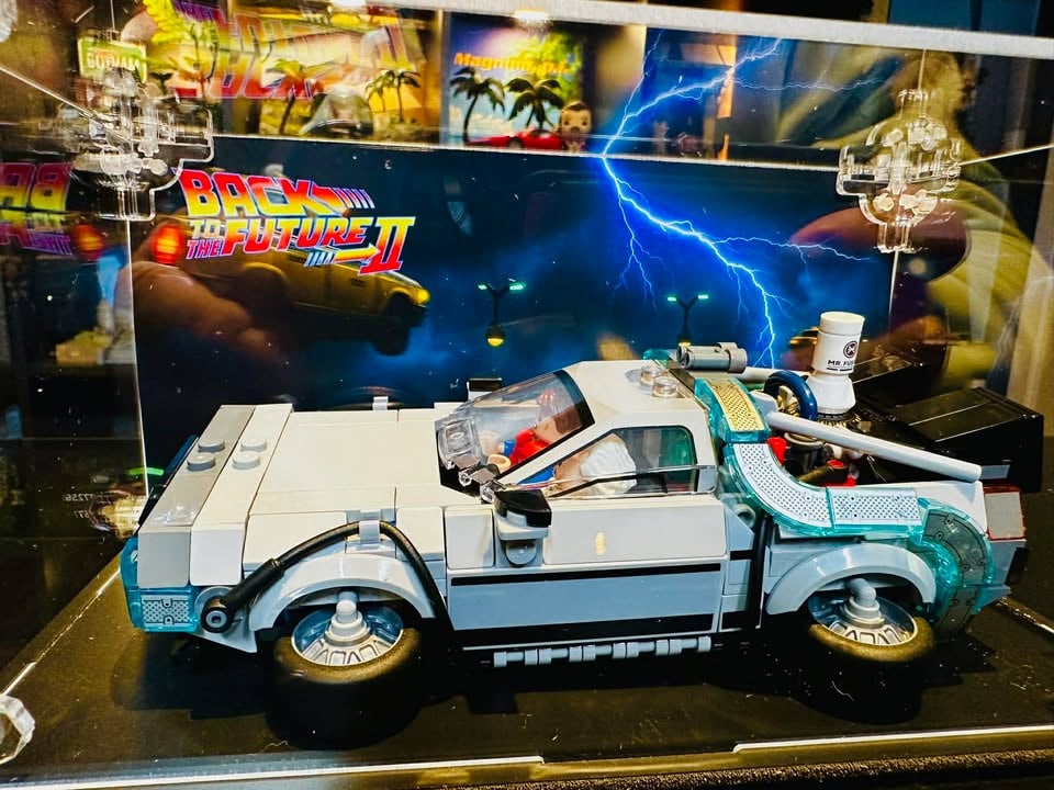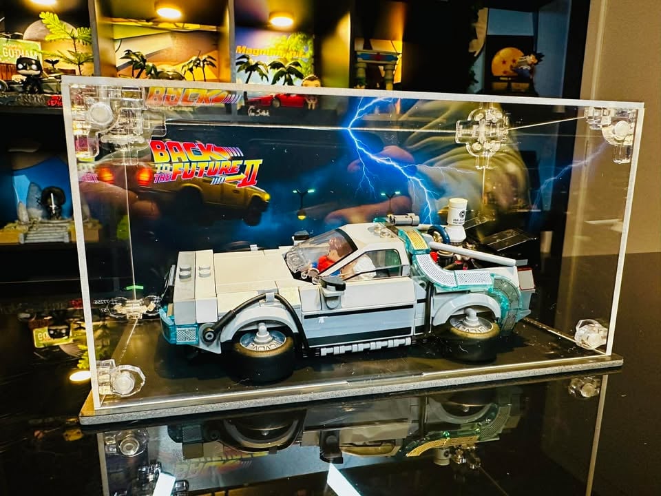 Mets en valeur ta LEGO DeLorean Time Machine (#77256) avec cette image de fond 20×10 cm (7,87 × 3,94 pouces), conçue pour être placée à l’intérieur d’une vitrine acrylique.