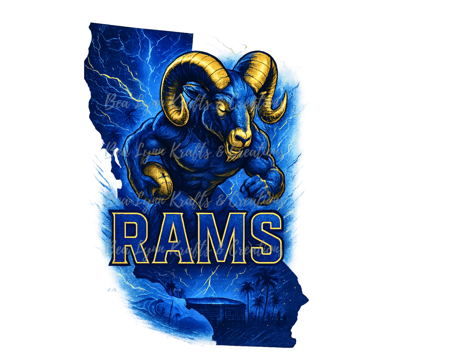 RAMS HOUSE, LET’S GO! This thunder-charged transparent PNG puts the power of Los Angeles football into overdrive. A muscular, blue-and-gold Ram mascot explodes through a lightning-split California map, horns gleaming and fists clenched, charging straight into victory. The iconic “RAMS” lettering dominates the center, backed by palm trees, storm clouds, and a sleek SoFi Stadium silhouette anchoring the bottom. Whether you're tailgating in Inglewood or repping LA from coast to coast, this design is built to electrify your merch and hype up the herd!