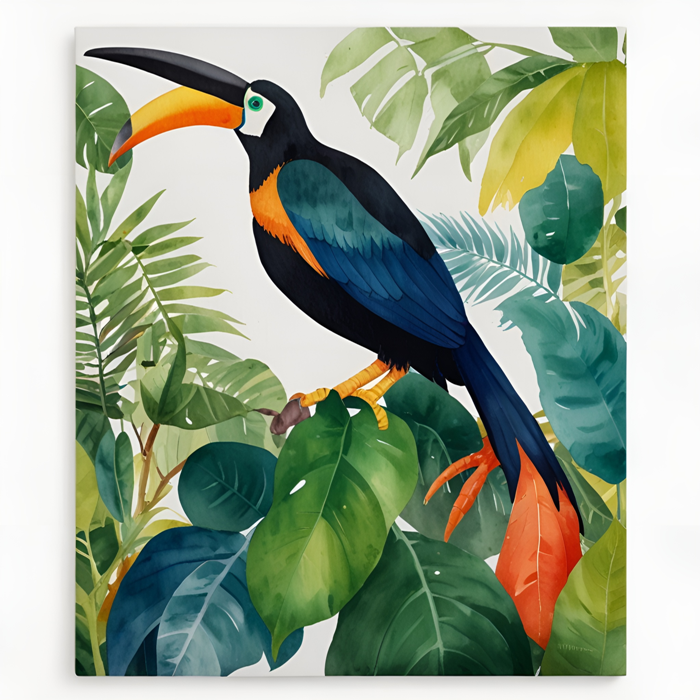 The image features a vibrant bird with a colorful beak, resembling a toucan or a hornbill. The bird is portrayed in a painting, showcasing intricate details of its feathers and beak. The beak stands out with its striking colors, adding to the bird's exotic appearance. This artistic representation captures the beauty and uniqueness of these tropical avian species.