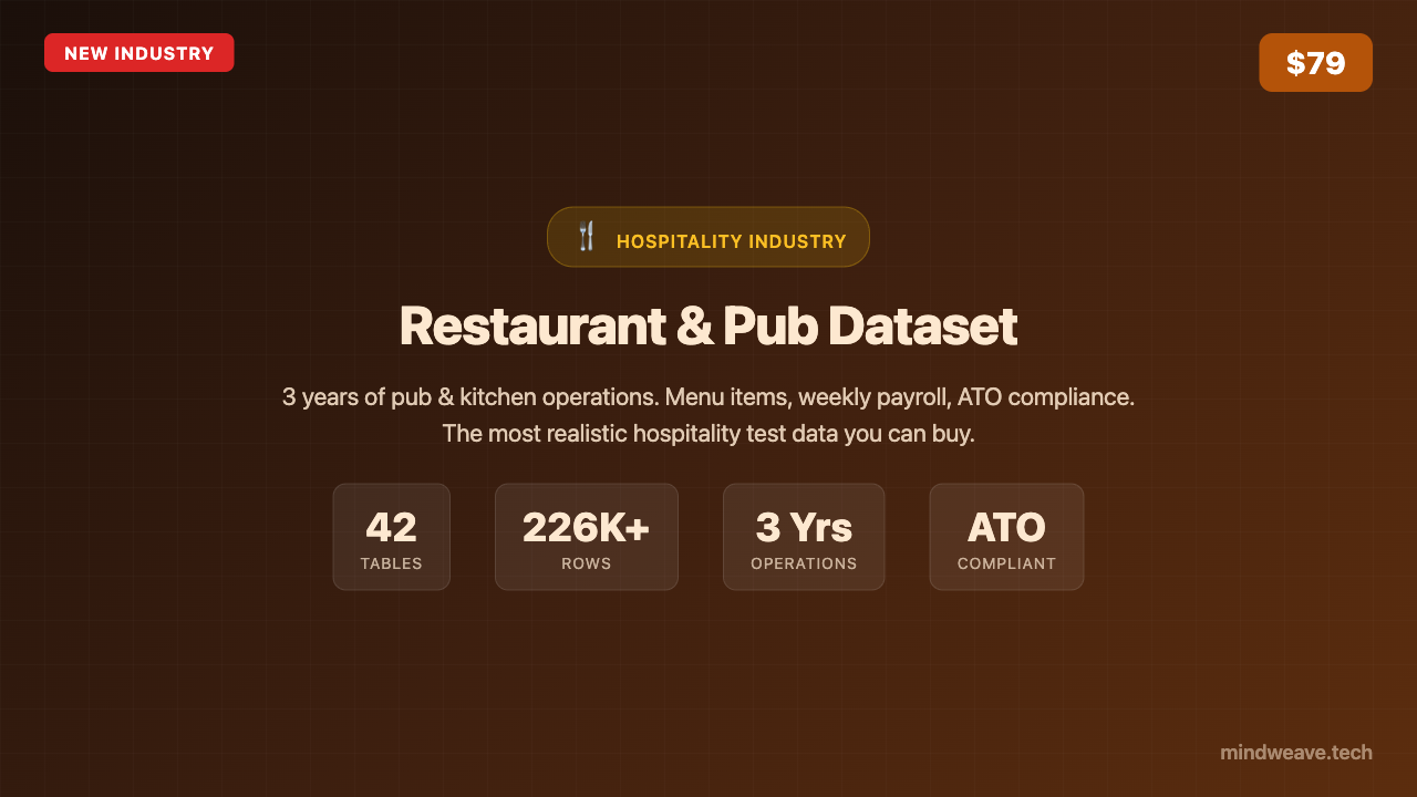 UK pub & kitchen dataset — "The Chequers Inn & Kitchen". 180,000+ rows, 42 tables, 3 years. HMRC PAYE, NI, 20% VAT, pension. Monthly payroll, 20 staff. CSV + SQL + Parquet + SQLite.