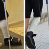 He first crutches from the car to the entrance. There was a queue at registration so he had to wait. We stand behind and next to him and can admire the cast on his right foot. The cast is made of plaster and is also almost completely wrapped with a white fiberglass bandage. You can only clearly see from the upper corner of the calf that the cast is actually made of plaster of paris. His toes are free and are not supported by any toe plate. He wears a black cast shoe under the cast, but he doesn't use it to walk. He is only on crutches.
