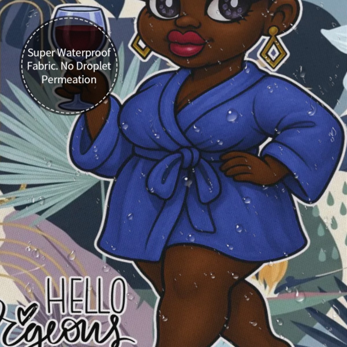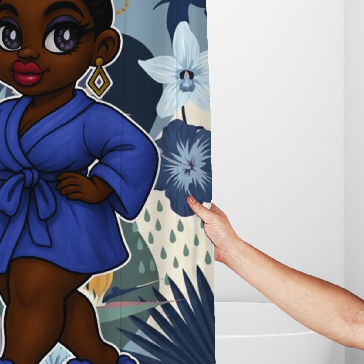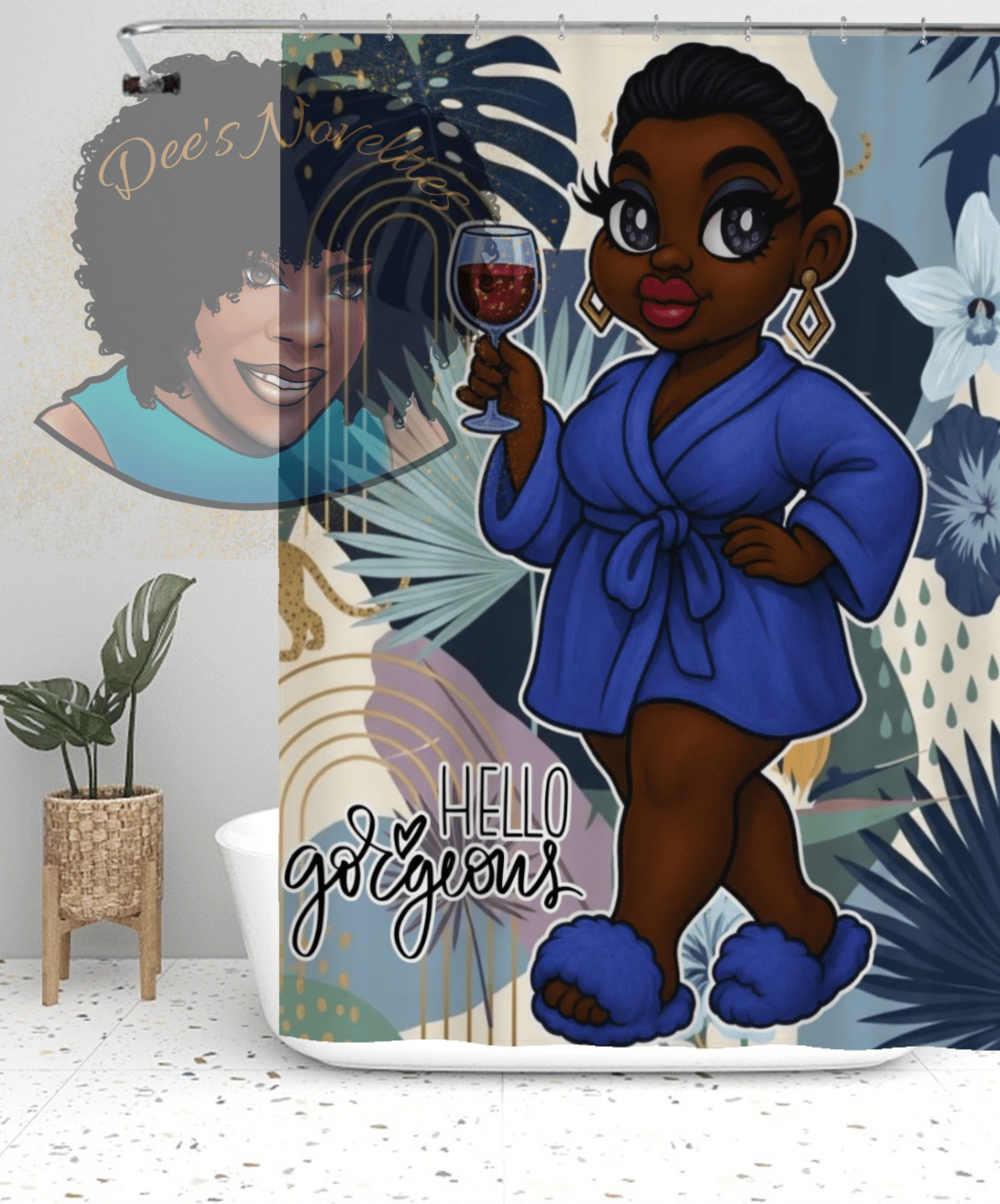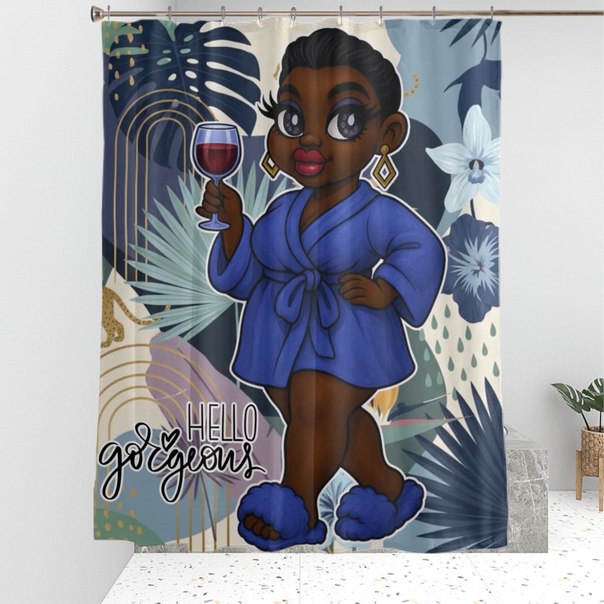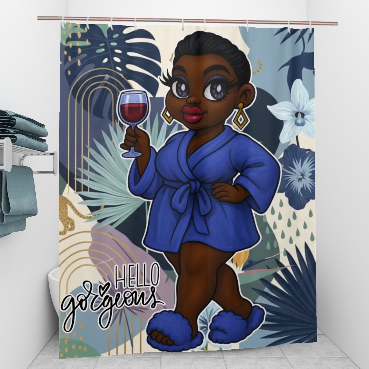 Let your bathroom serve looks with our “Hello Gorgeous” shower curtain – a celebration of curvy beauty, bold self-love, and Afrocentric glam. Featuring a fabulous illustrated Black woman wrapped in a luxe periwinkle robe, wine glass in hand, full lashes, glossy lips, and a confident pose. Surrounded by deep tropical leaves, gold accents, and the uplifting phrase “Hello Gorgeous,” this piece turns any bathroom into a sanctuary of slay.