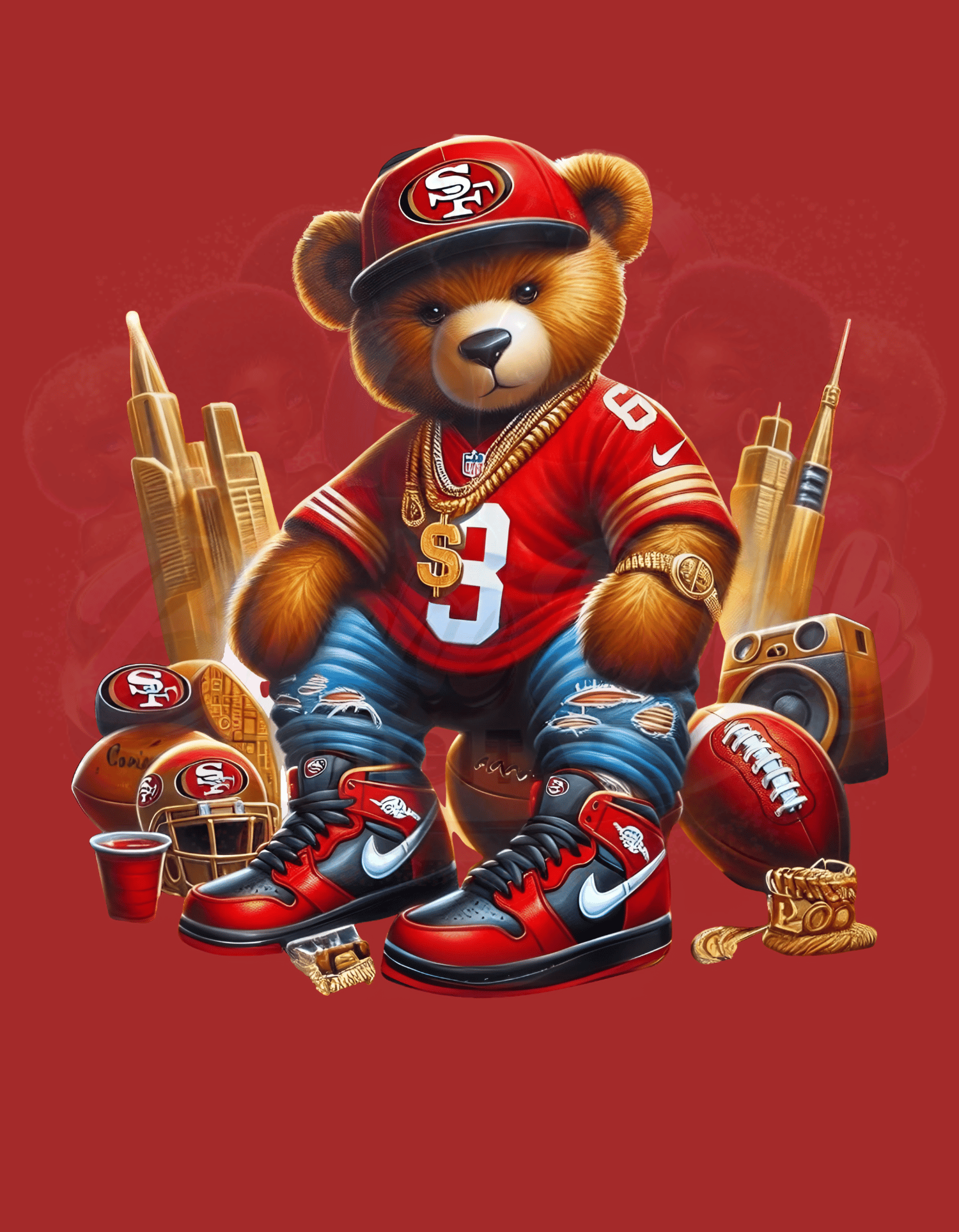 "Celebrate your San Francisco 49ers pride with this vibrant hip-hop-inspired digital illustration! Featuring a stylish bear in 49ers-themed gear, complete with gold chains, sneakers, and a bold cap, this design captures the spirit of urban culture and football fandom. Perfect for crafting custom T-shirts, hoodies, mugs, stickers, or wall art, this high-resolution PNG file with a transparent background is ideal for sublimation and print-on-demand projects. Instantly downloadable, this design is a great addition for 49ers fans and creative crafters.