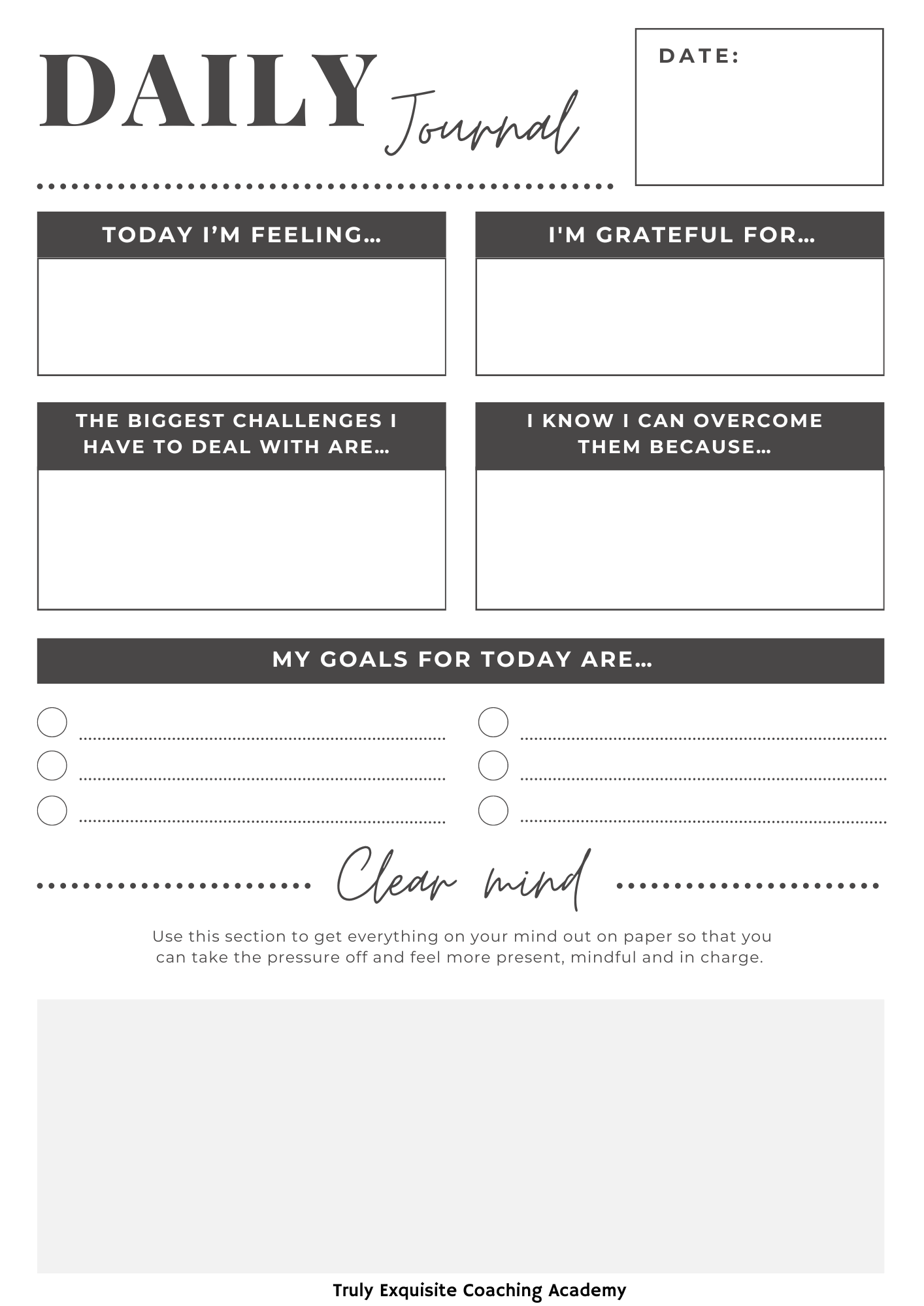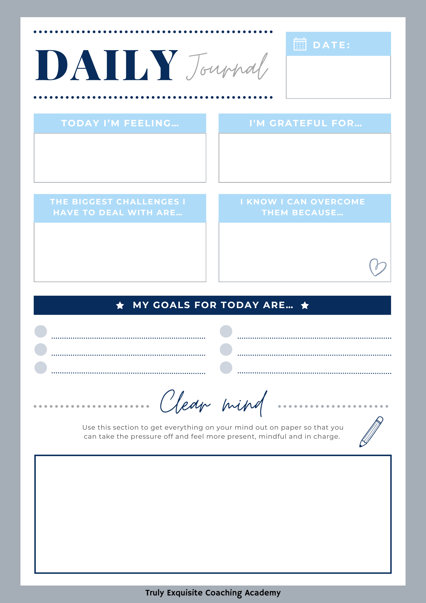 This Daily Journal is the perfect tool to help you connect with your feelings, practice gratitude, remind yourself of your goals, build confidence and keep a clear mind, day after day.