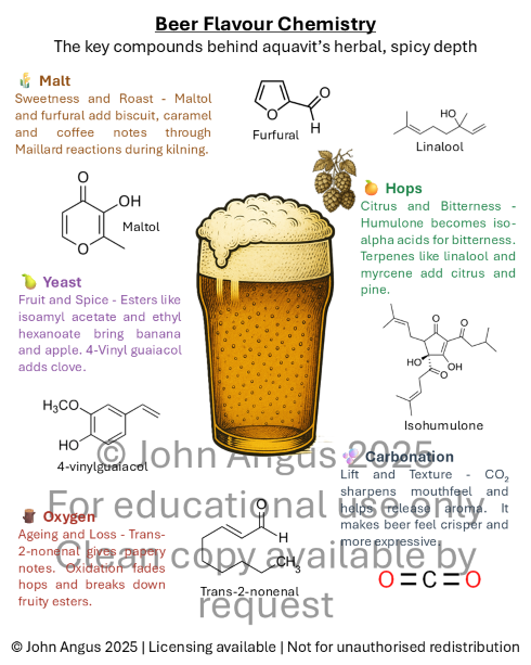 - 🌾 Malt → Maillard products like maltol and furfural give biscuit, caramel and roast