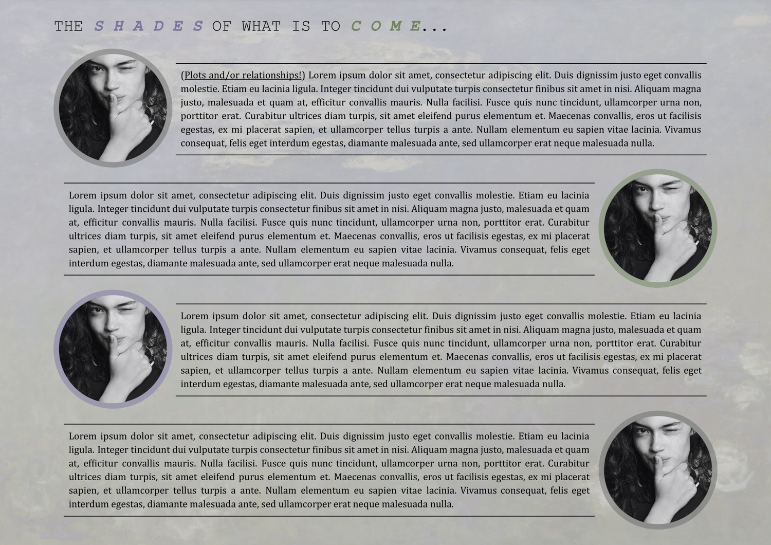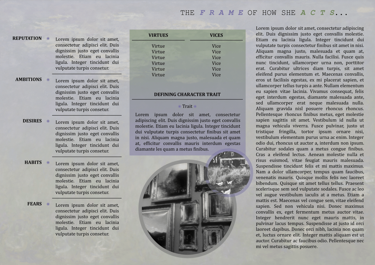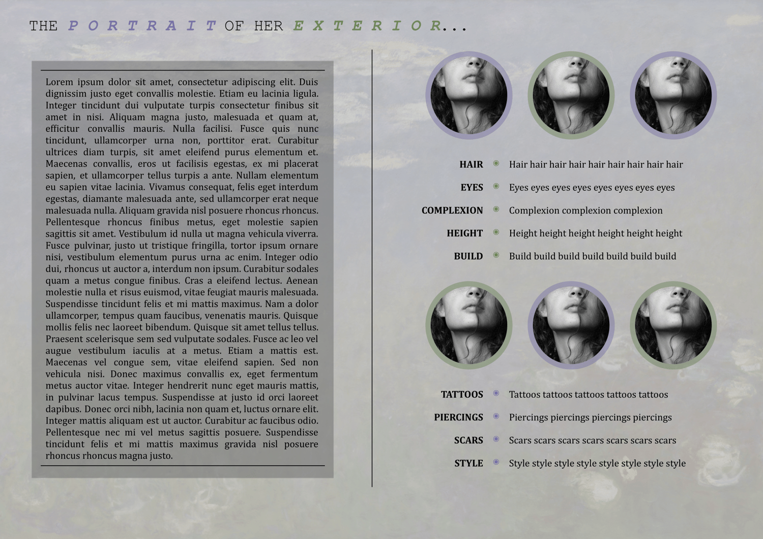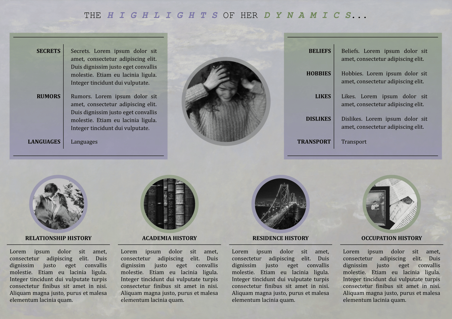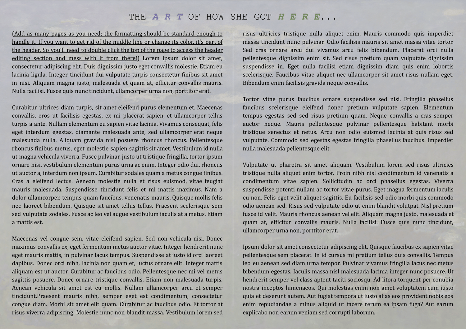 - The "Backstory" page is formatted in a way that will allow you to use more pages without any formatting issues. The text will simply continue on in a two-column manner and push the last page back. However, the background image and lil middle line don't go automatically onto each new page, so you'll need to manually add that. You may also choose to add decorative foreground images to these pages, but that is up to your discretion. Not having images in the master template was the smoothest way to ensure your backstory length could continue on however long without ruining any formatting.