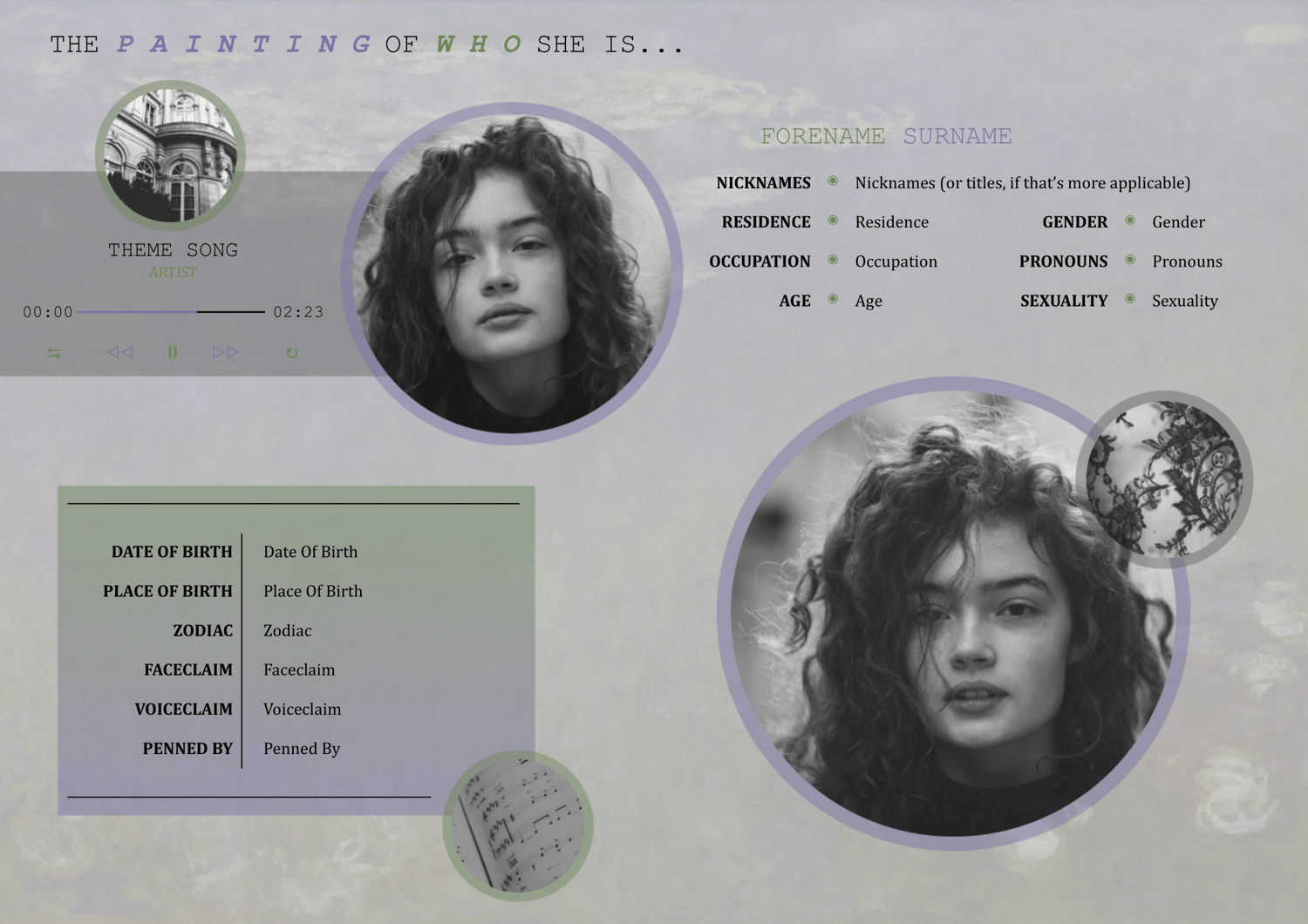 This is a cutesty seven-page Google Doc template designed to be used for a single muse. I wanted to make one more light and airy template before I give into the haunting darkness of all my upcoming ideas hehe.