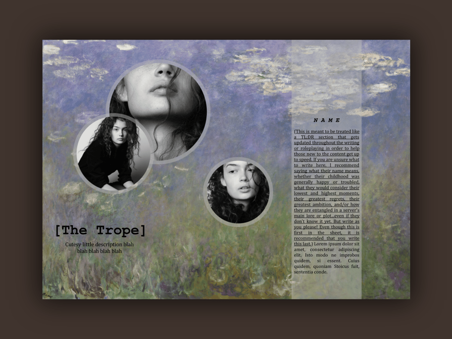 Page Order: Cover/TL;DR, overview, backstory (decided to try it out earlier haha), personality, appearance, details, and relationships/future plots.
