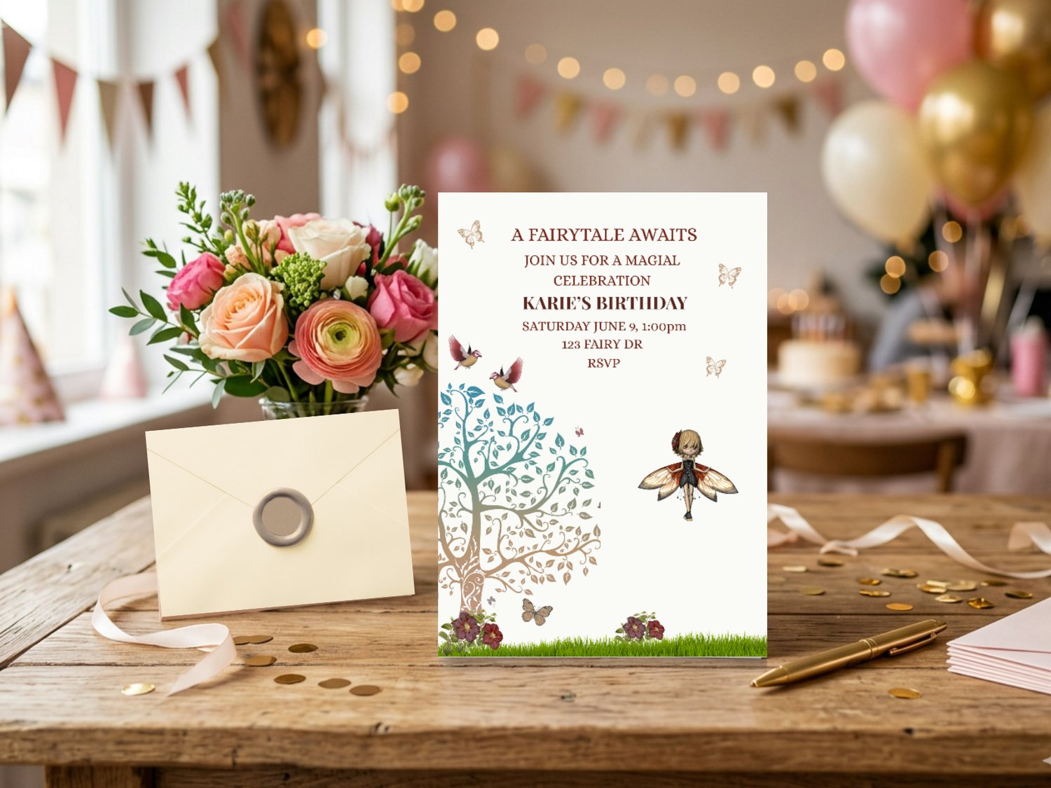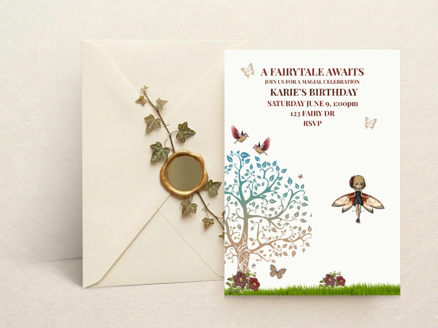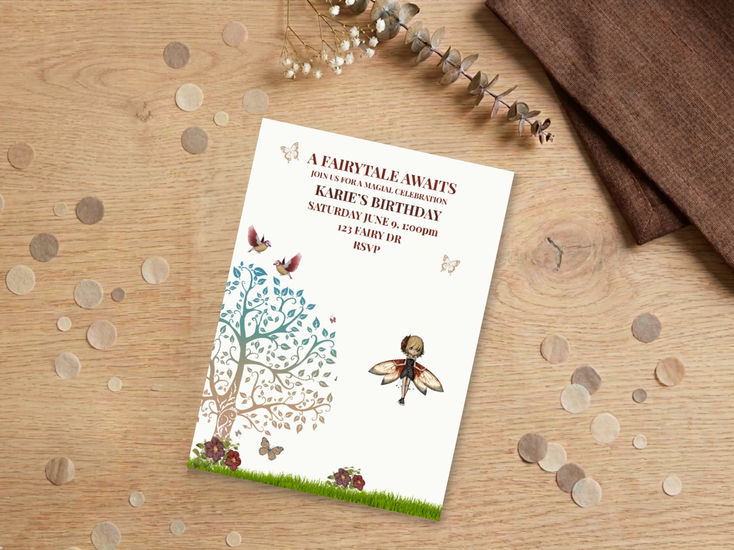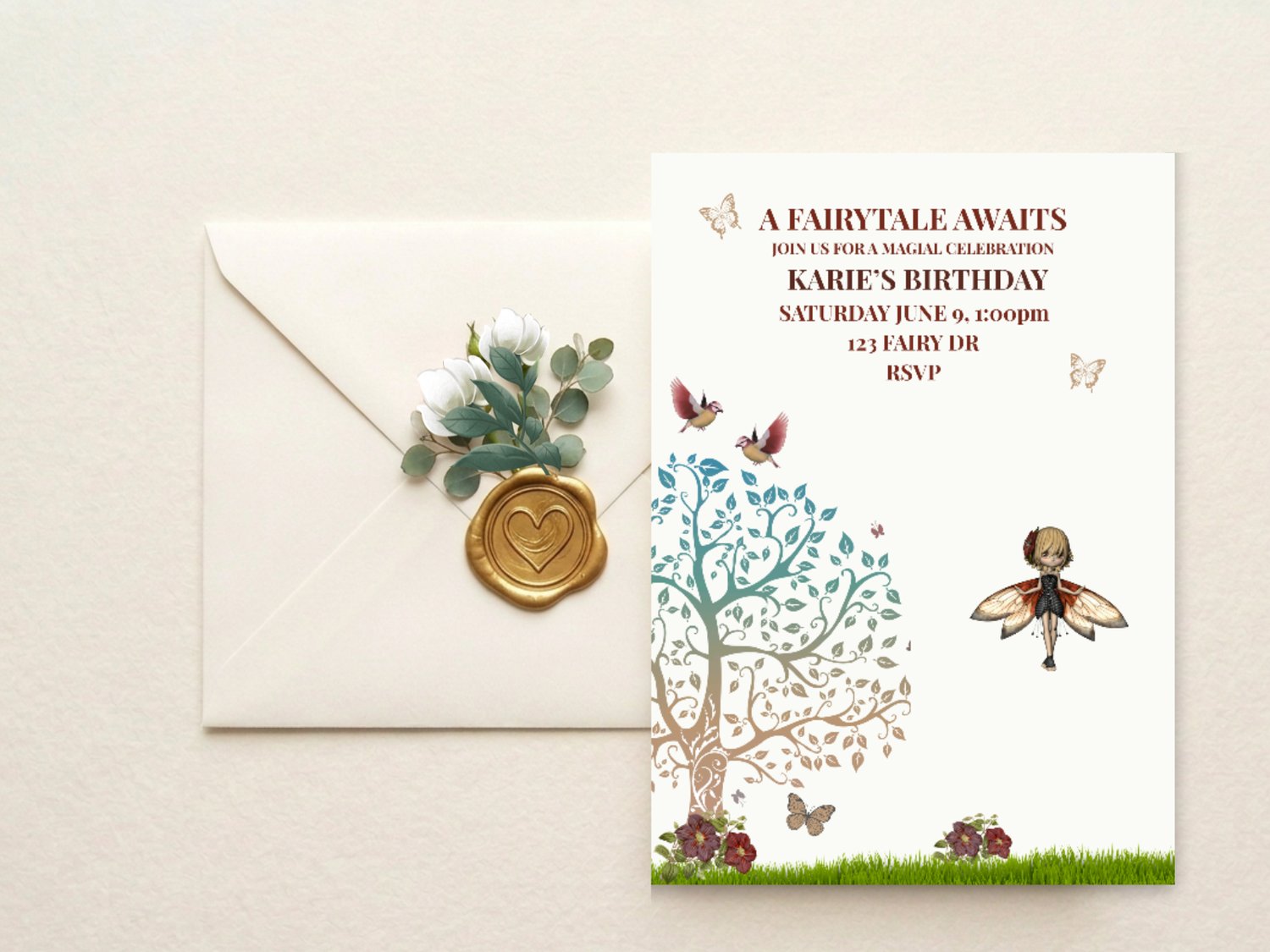 Planning a birthday party can feel overwhelming, especially when you want something magical and unique. This A Fairytale Awaits birthday invitation takes the stress out of the process. Designed with soft earthy tones, butterflies, birds, and a dreamy woodland tree, it creates a storybook look that older girls love — and since it’s fully editable, you can customize it in minutes without any design experience.