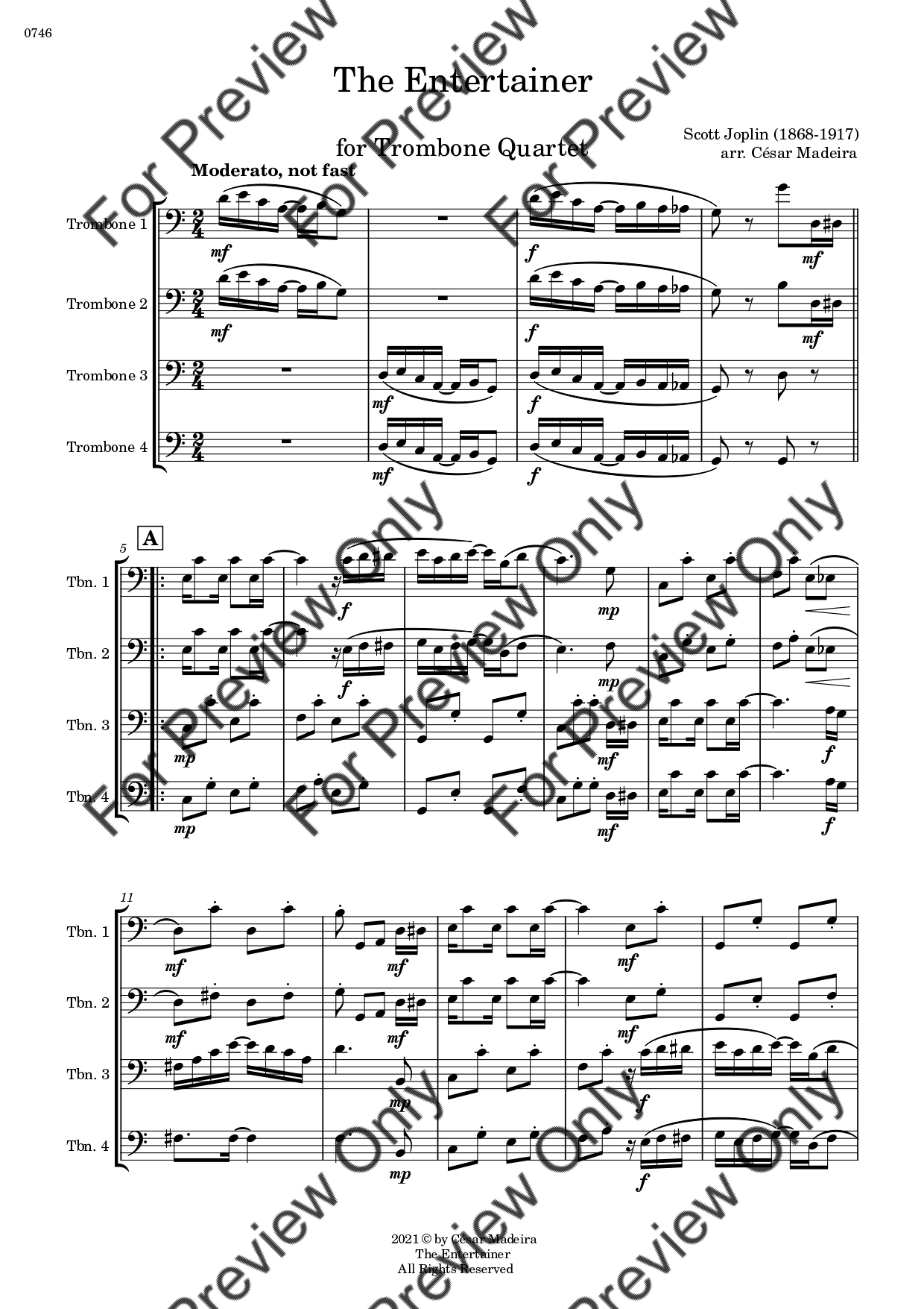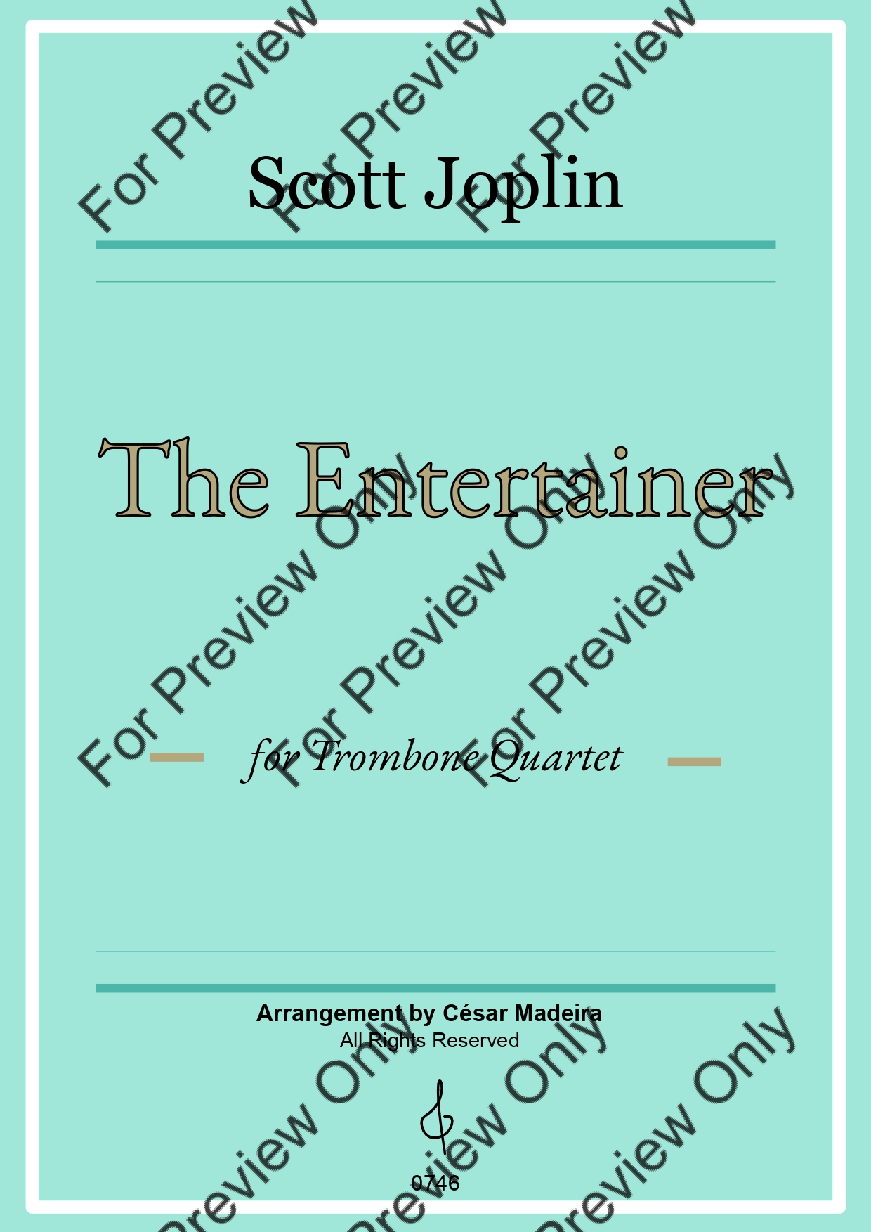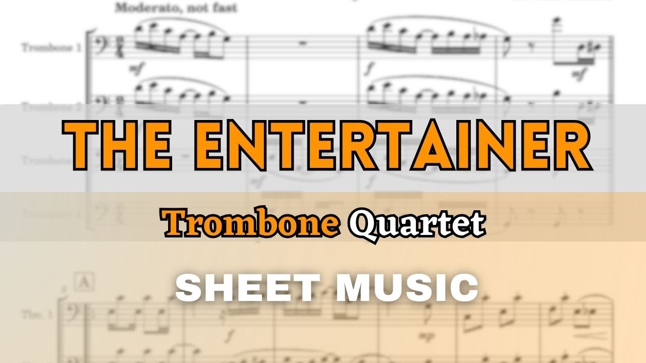The Entertainer by Scott Joplin. Arrangement for Trombone Quartet. With Full Score and Individual Parts. Have fun!