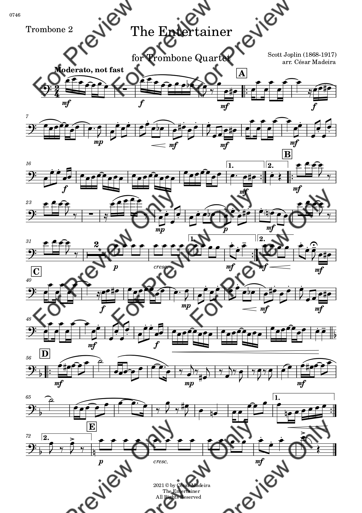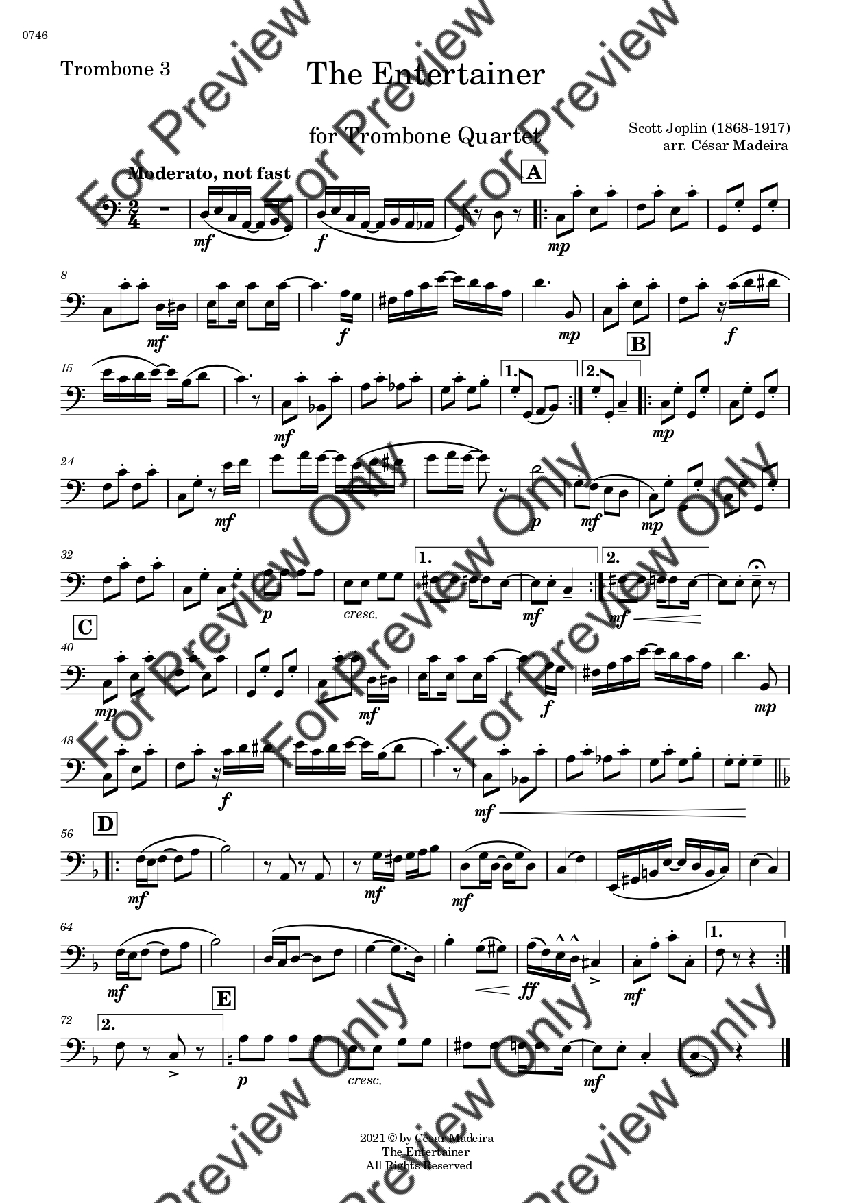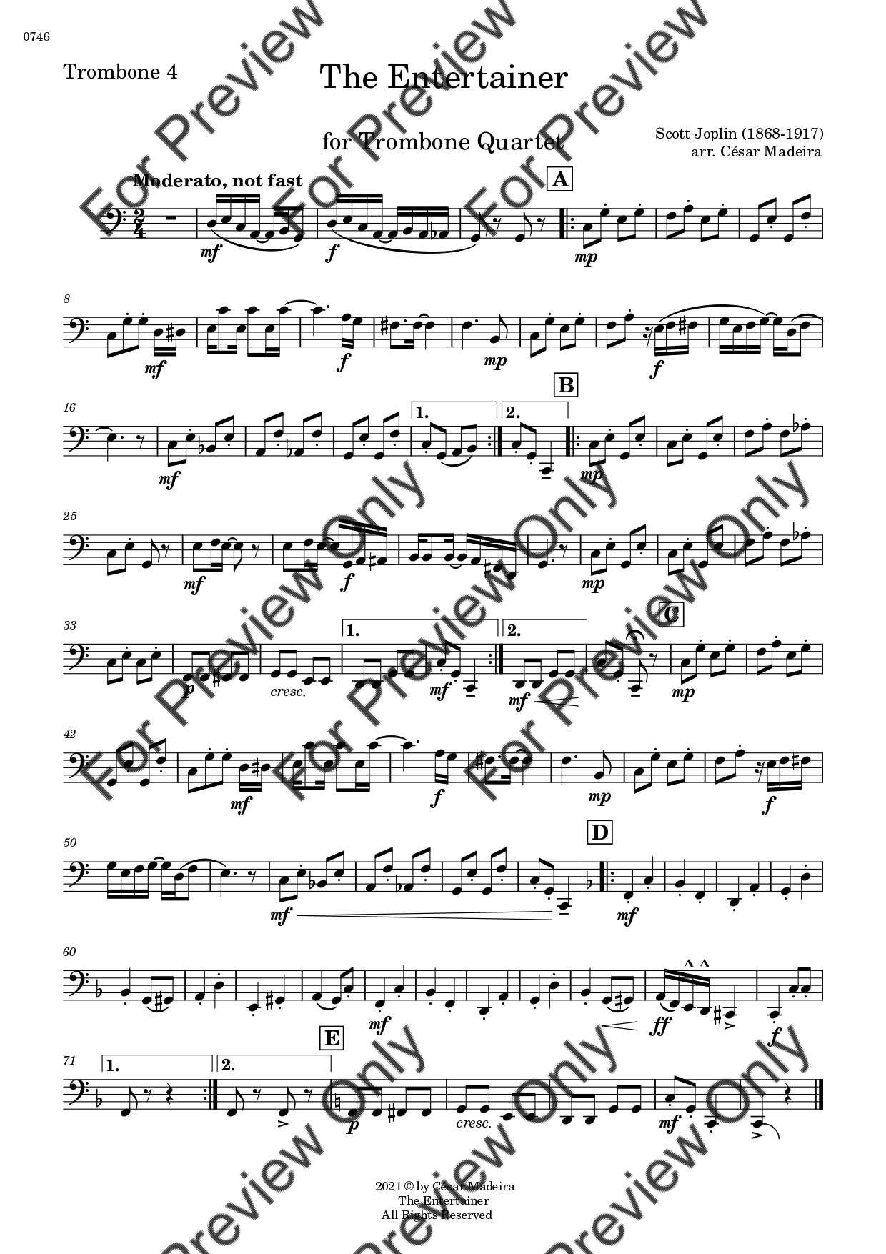 The Entertainer by Scott Joplin. Arrangement for Trombone Quartet. With Full Score and Individual Parts. Have fun!
