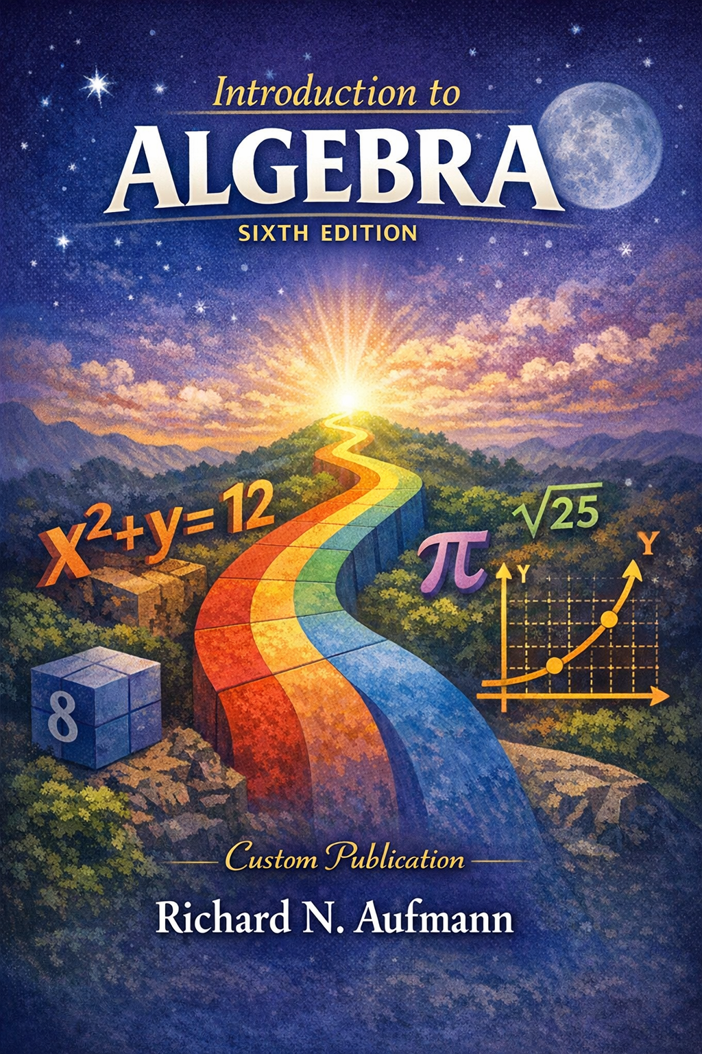 This sixth edition of Introduction to Algebra is a specialized custom publication authored by Richard N. Aufmann, designed to provide a foundational understanding of algebraic concepts. The textbook offers a structured approach to learning, covering essential topics such as the properties of real numbers, solving linear equations and inequalities, polynomials, factoring, and graphing. Known for its clear explanations and integrated problem-solving strategies, this edition is tailored to meet specific curriculum requirements while helping students develop the mathematical proficiency needed for advanced coursework. It serves as a comprehensive resource for students seeking to master fundamental algebra through practical examples and rigorous exercises.