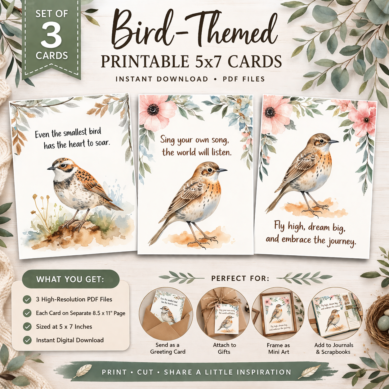 This beautiful set of three printable 5x7 greeting cards features delicate watercolor birds paired with uplifting, heartfelt messages. Each design captures a soft, nature-inspired feel, making these cards perfect for encouragement, support, or simply brightening someone’s day.