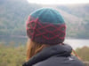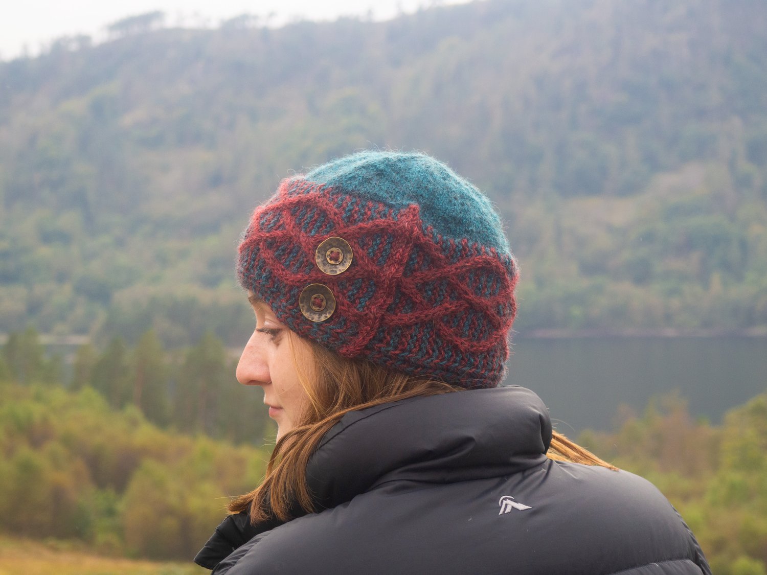 The two-colour cable band is worked first as a strip and then the stitches for the crown are picked up and worked in the round.
