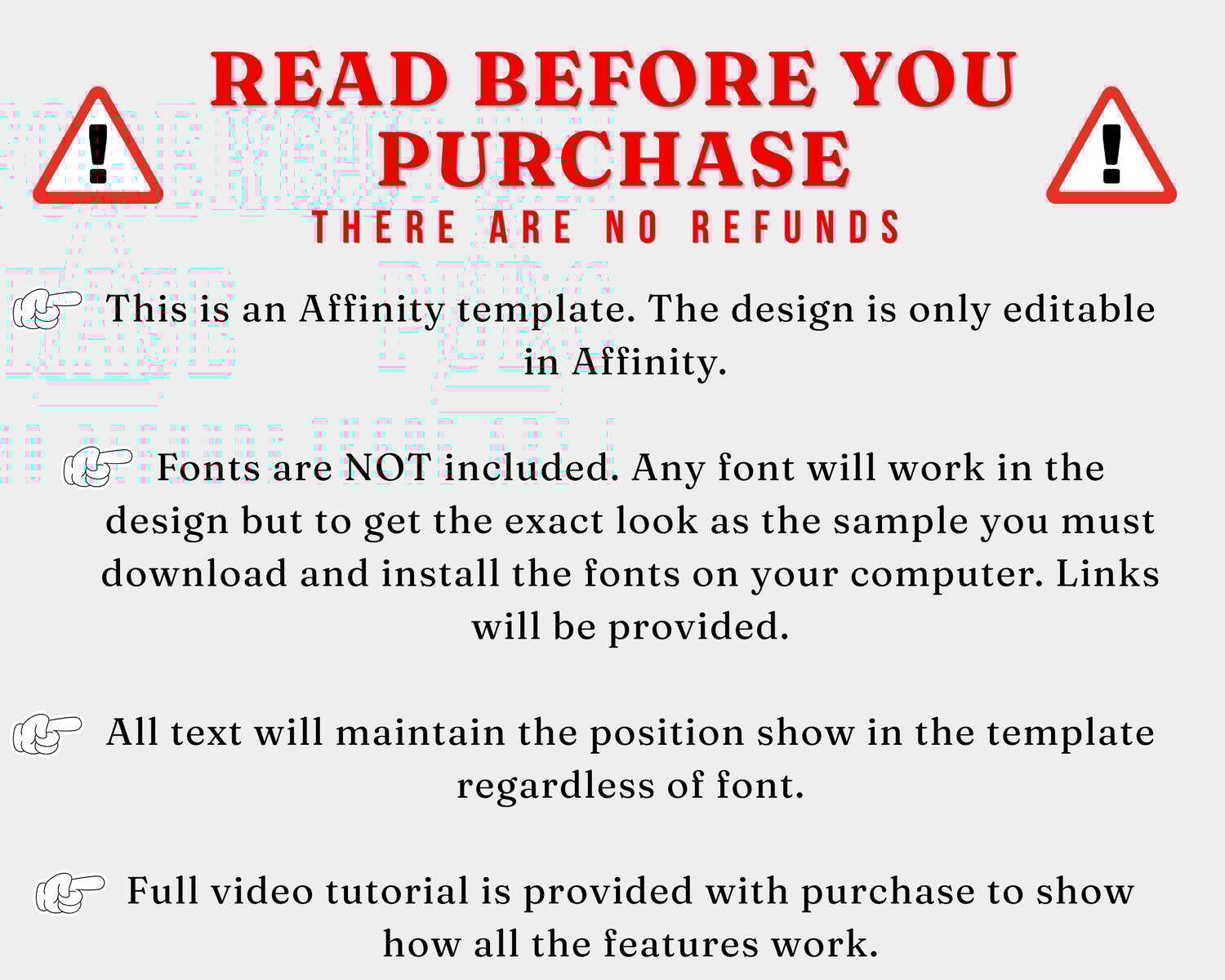 You will receive 1 Affinity template and 1 PDF file links to a tutorial and the fonts used in the sample design. Please reach out with any questions. You MAY NOT share this file with anyone!!