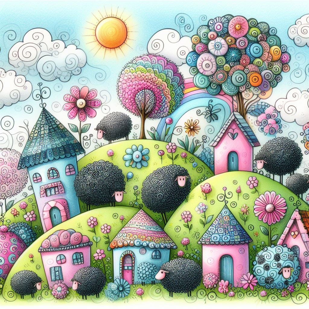 A whimsical world. Quirky little pink & blue houses made of mosaics & roofs made of petals, on hills which are round & are patterned. There are pretty flowers & tall bendy trees. There are lots of big black curly sheep grazing in a field.