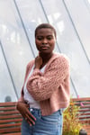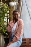 Bindweed is knit from the top down in a seamless raglan manner. The front sections and the back are worked in stockinette, and balloon sleeves are richly decorated with a pattern of intertwined cables and nupps. The side border of the cardigan is knit at the same time with the body and has a small cable running along a few 2x2 rib stitches. The bottom is finished with a folded stockinette hem.