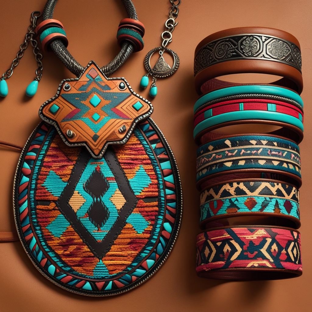 A jewelry design that combines traditional Anatolian Turkish ethnic kilim patterns and leather, featuring intricate geometric shapes and motifs in earthy tones such as terracotta, sienna, and umber, with accents of vibrant turquoise and crimson, set against a warm, natural leather background, with ornaments and embellishments that evoke a sense of cultural heritage and nostalgia, including a statement piece necklace with a large, ornate pendant and a series of stacked, chunky bangles, each one showcasing a unique kilim-inspired design element, such as stylized florals, scrolling vines, or tribal patterns, all meticulously rendered in a style that blends traditional craftsmanship with modern, edgy flair.