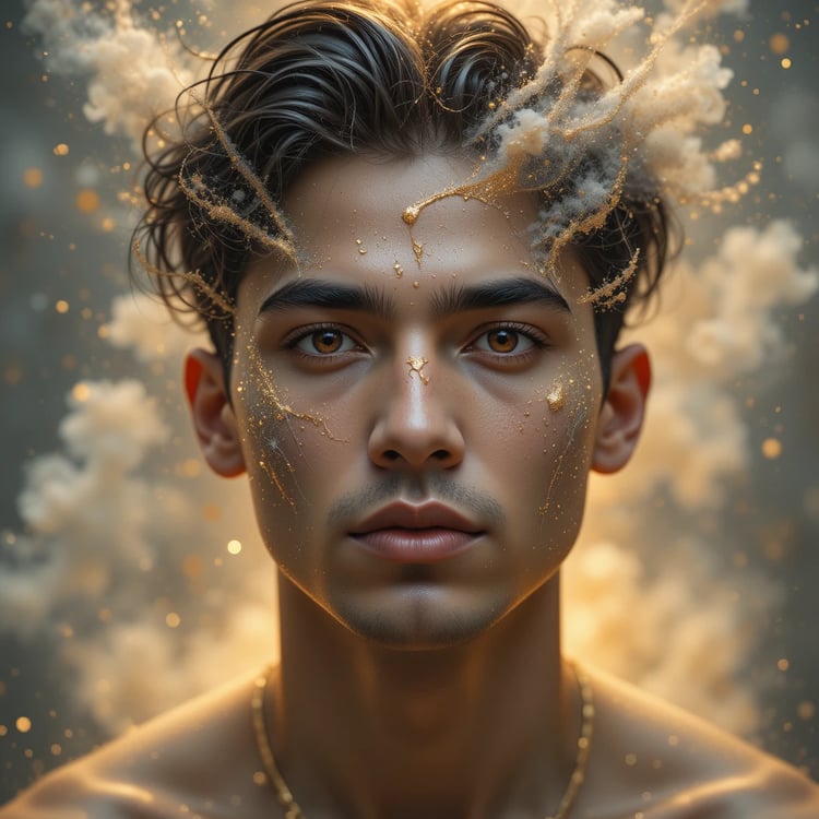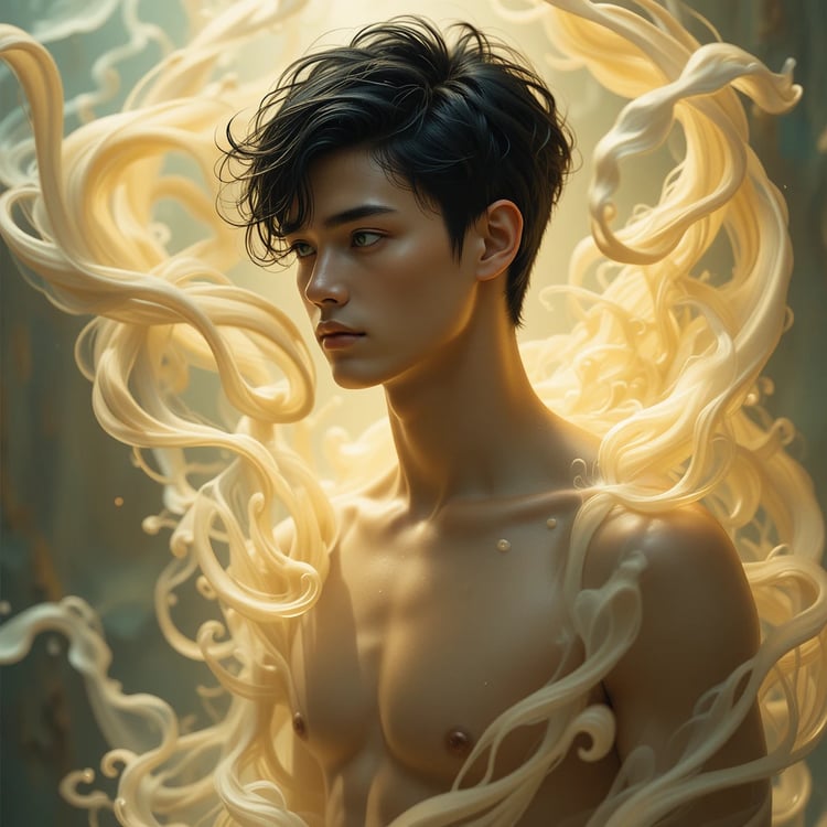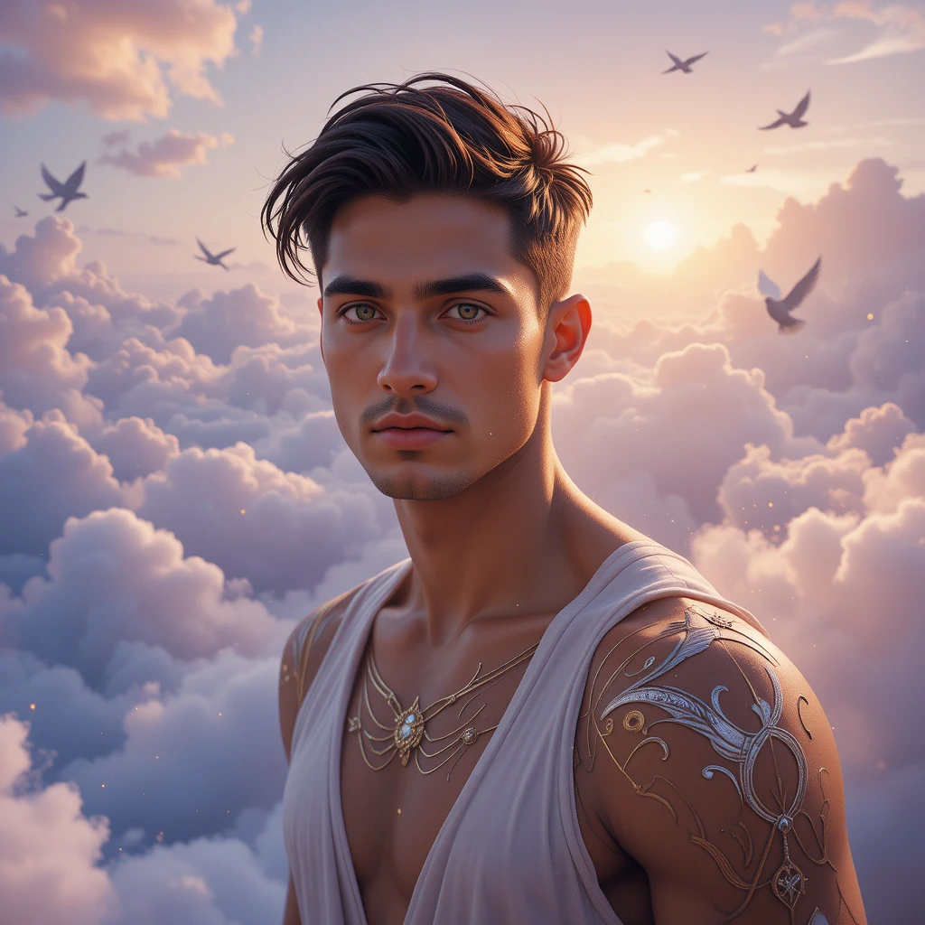 Ascend into the sublime with Celestial Rapture, an AI-generated fantasy portrait of an alluring male figure drifting among radiant clouds and distant birds in flight. His gaze is magnetic, his form almost divine—surrounded by light and air, where every feathered silhouette adds to the dream. Seductive and serene, he embodies a moment of heavenly surrender, caught between rapture and reverie.