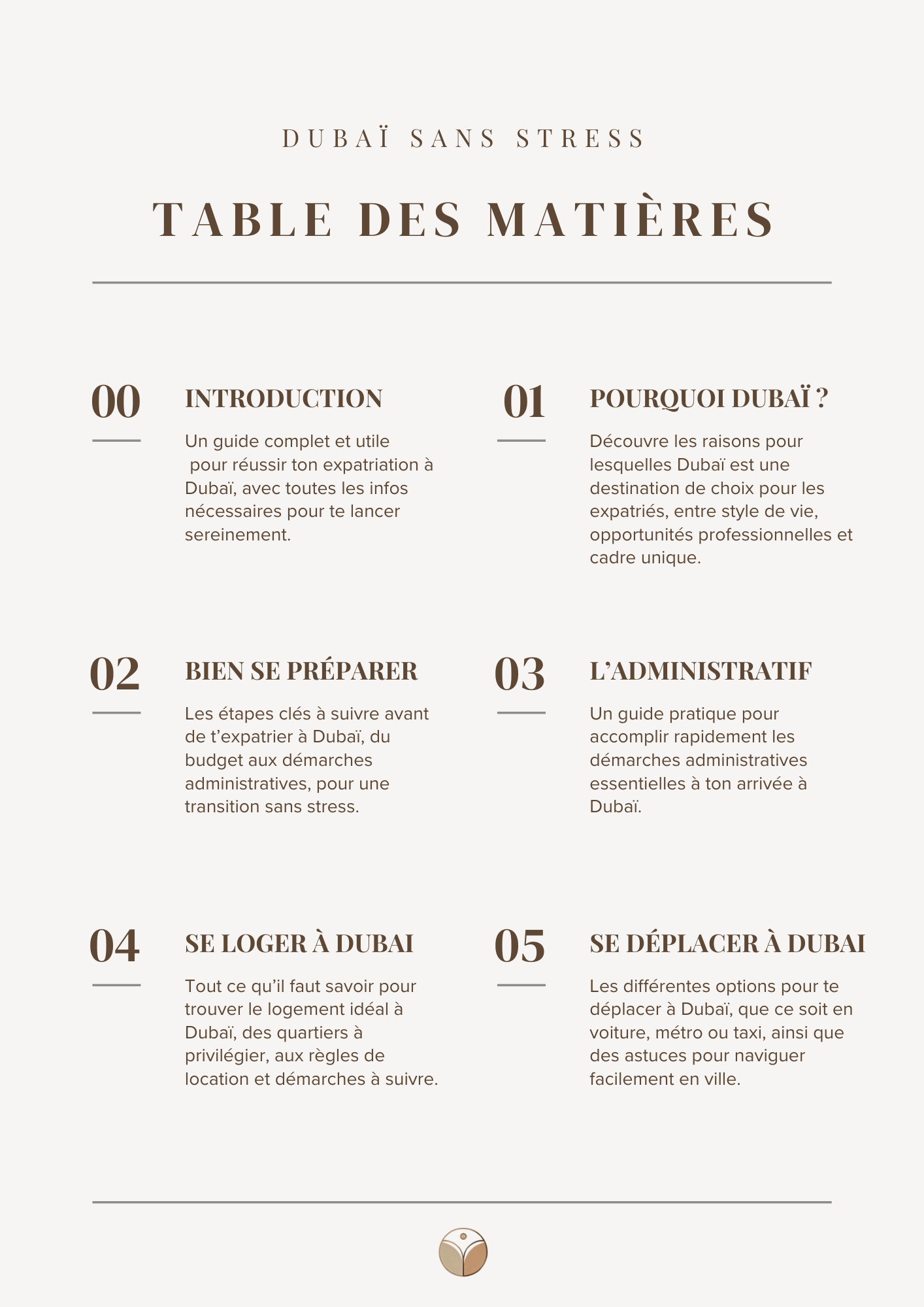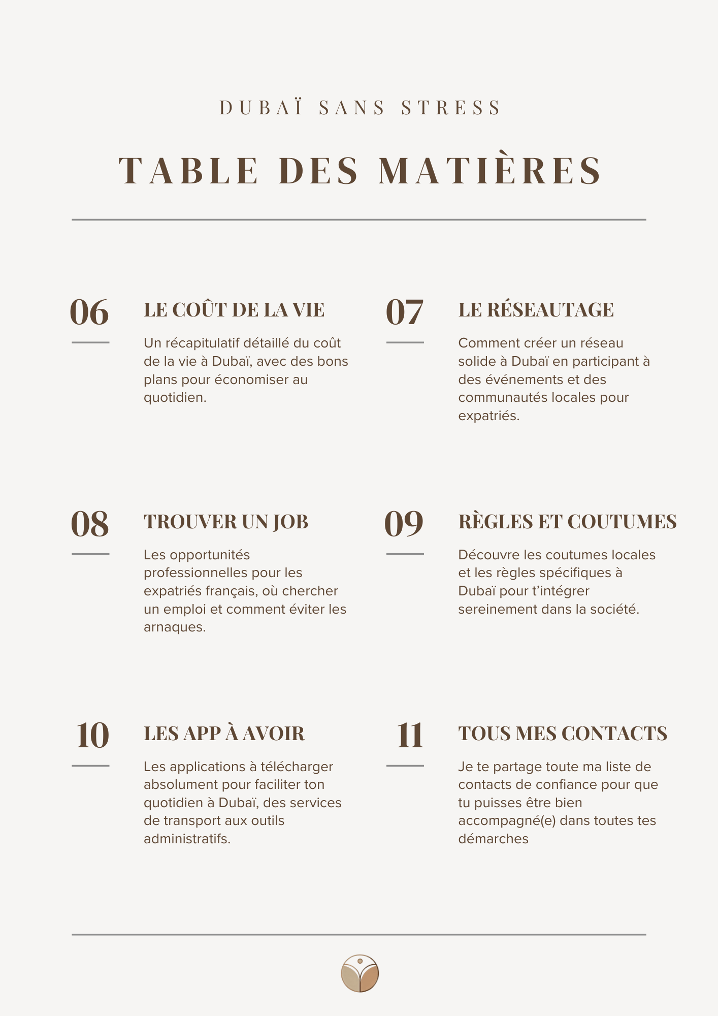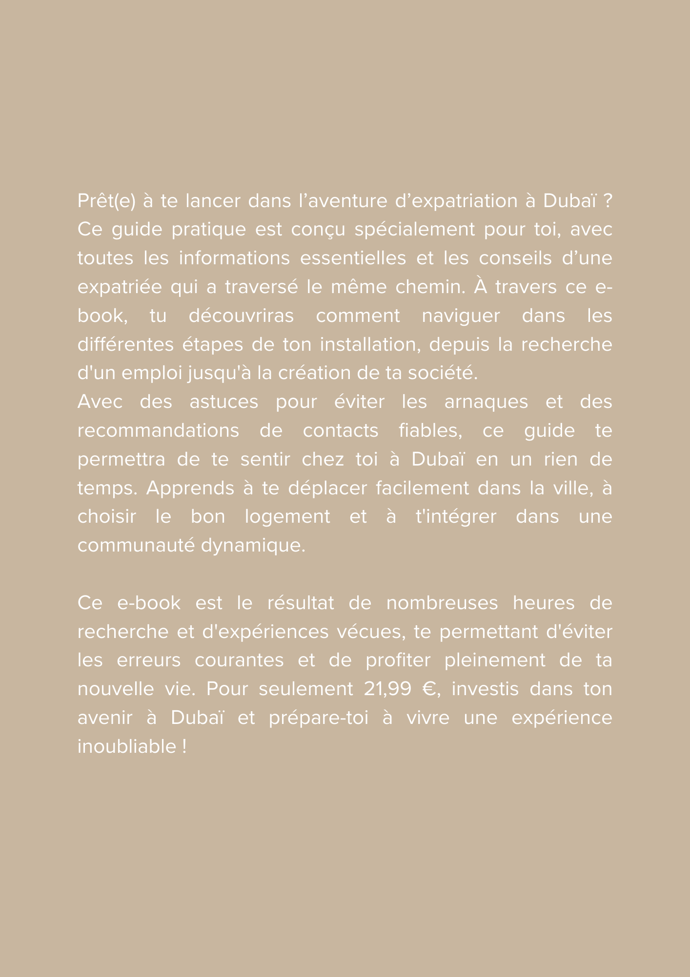 Prêt(e) à plonger dans l’aventure d’expatriation à Dubaï ? 🌟 En tant qu'expatriée qui a récemment fait le grand saut, je comprends toutes les questions et les incertitudes que tu peux avoir. C'est pourquoi j'ai créé ce guide pratique ! Dans ce e-book, je partage mes astuces, conseils et contacts essentiels pour t’aider à naviguer dans ta nouvelle vie à Dubaï. Pour seulement 21,99€, tu auras accès à toutes les informations qui te permettront de te sentir chez toi plus rapidement, tout en évitant les pièges courants. Ne laisse pas le stress de l’expatriation te freiner : investis dans ton avenir à Dubaï et prépare-toi à vivre une expérience inoubliable ! 🌍✨
