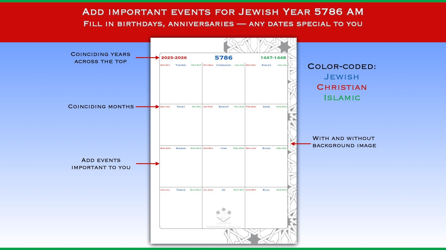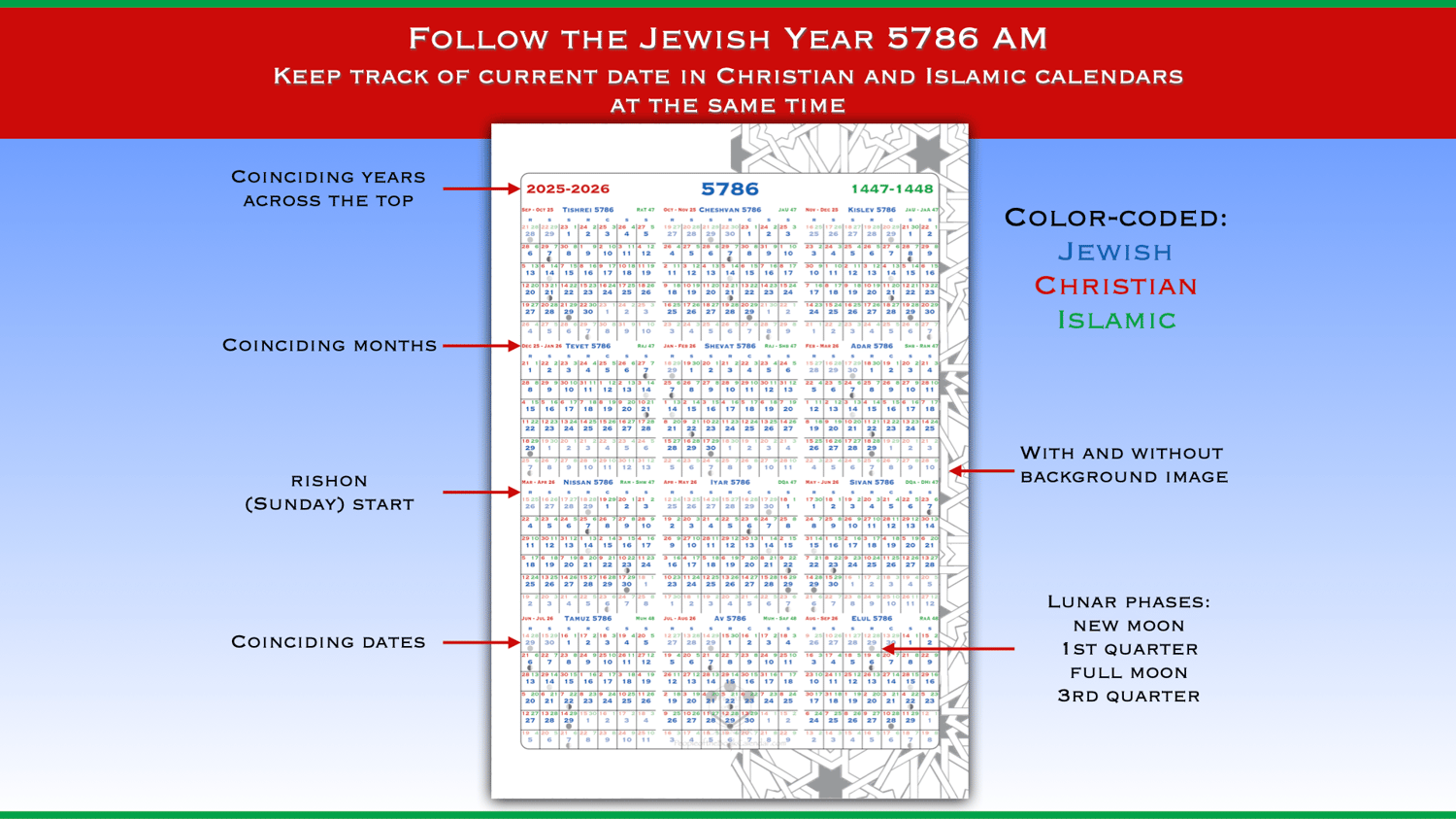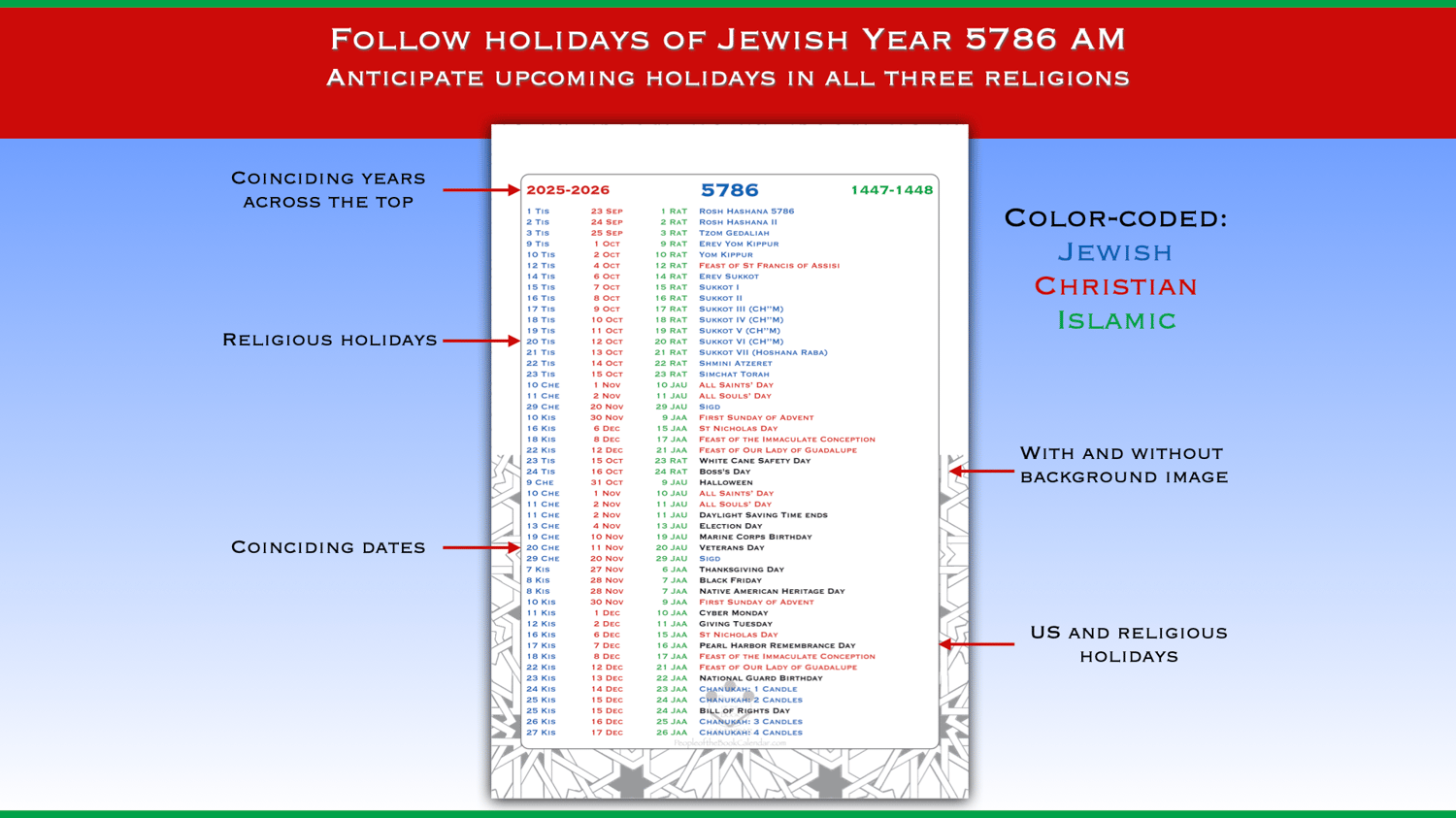 Jewish, Christian and Islamic calendars combined into one. I call it the People of the Book Calendar, referring to the "people of scripture", specifically that of the three Abrahamic monotheistic religions.