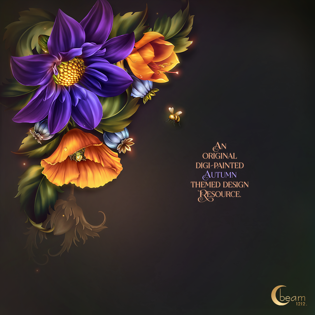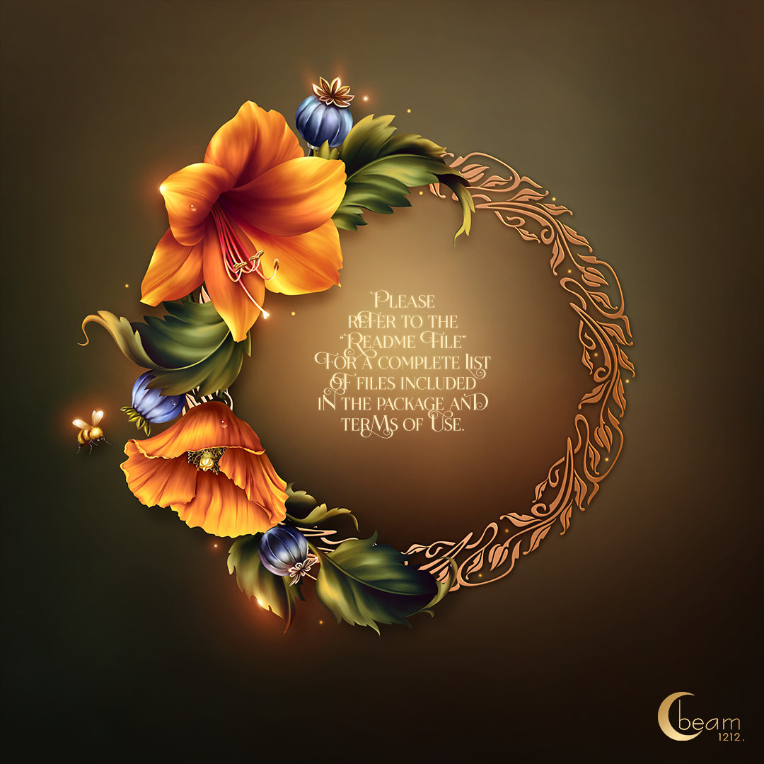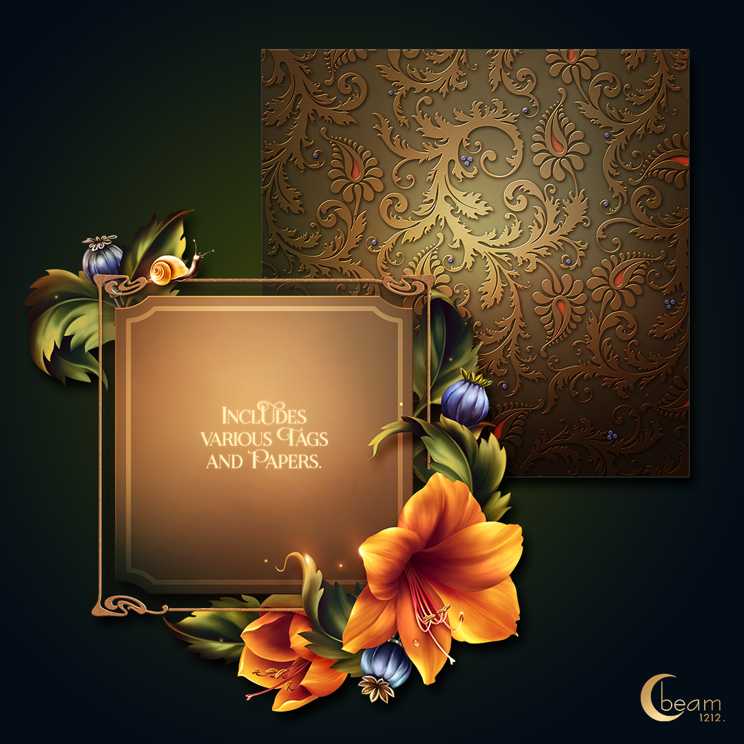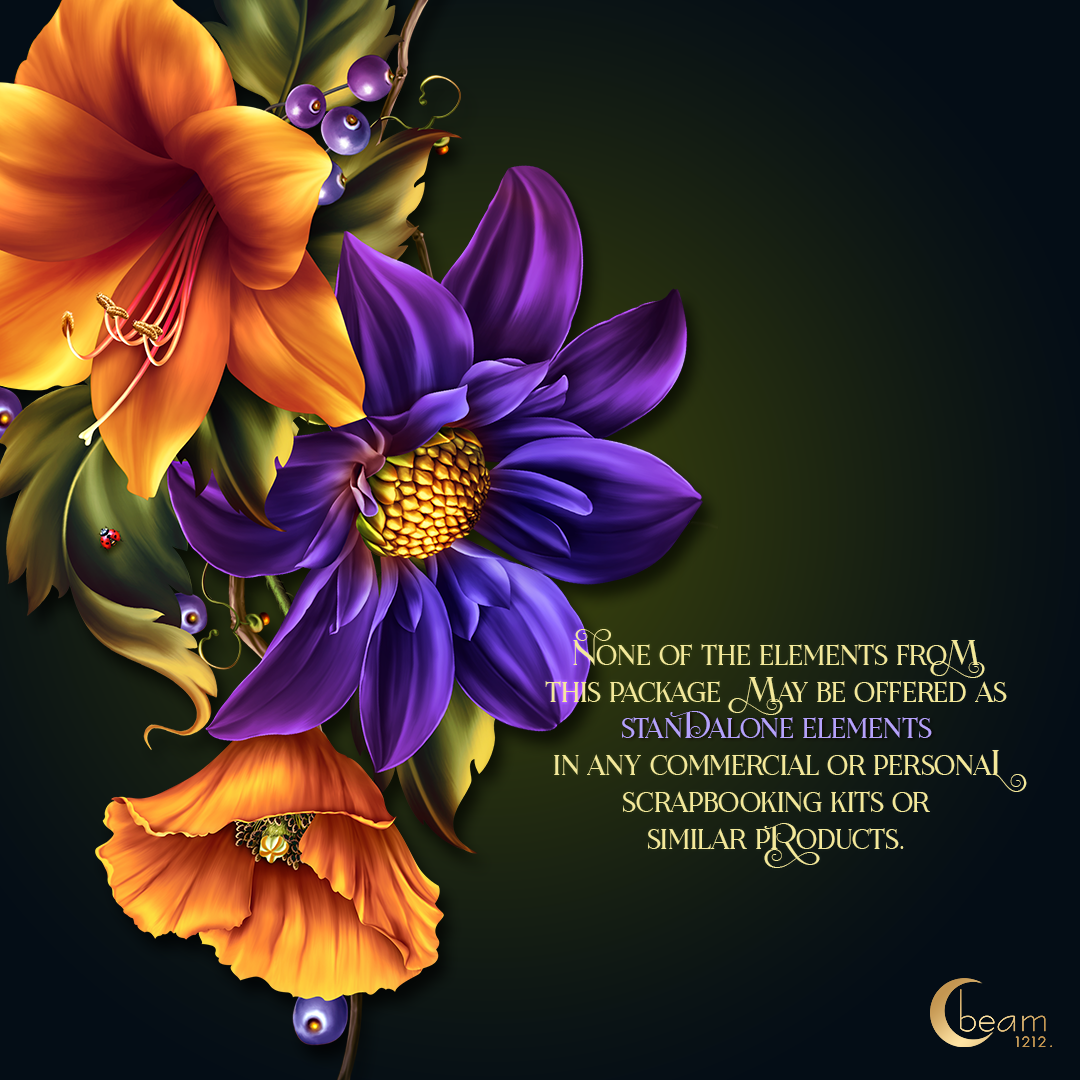 Moonbeam's "Autumn Garden" is a floral themed autumn design resource created with pretty Amaryllis, Dahlia, Poppy and finished with colorful berries and tiny garden critters. Designed in a fall color palette, this product is unique and one-of-a-kind in every way. Package contains a selection of pre-made background papers and tags, ready to use quickpages, matching papers and a standalone vignette. Everything included in this package is saved in .png format and saved at 300 dpi. None of the elements provided in this collection can be re-packaged "as-is" as elements in any commercial scrapbooking kits. The vignettes provided in this package are for personal use only but can be used to design commercial products if incorporated as a part of a derivative design and cannot be extracted from the derivative work. The elements from this package can only be used to create derivative designs for commercial and personal projects, as outlined in my TOU, but may not be used to create another merchant resource which competes with the original product.