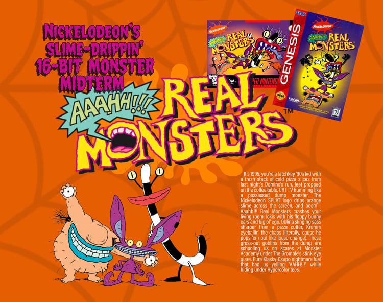 - Aaahh!!! Real Monsters nightmare fuel – the 1995 platformer chaos on Sega Genesis and SNES, where you switch between Ickis, Krumm, and Oblina to scare humans, solve puzzles, and pass monster midterms with gooey abilities, freaky level designs, and that signature Nickelodeon slime vibe.