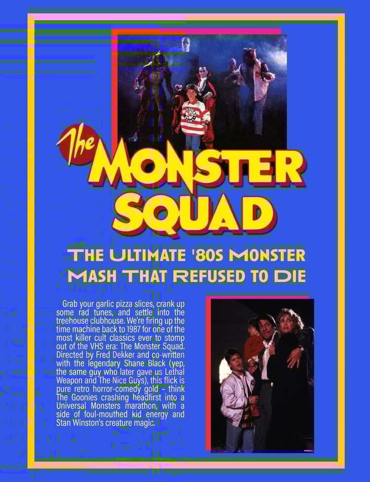 - The Monster Squad cult classic revival – the 1987 Fred Dekker gem where a squad of monster-obsessed kids faces off against Dracula and his Universal horror crew in a battle for an amulet of good vs. evil, packed with treehouse HQ vibes, killer practical effects (thanks Stan Winston!), quotable one-liners, and why this "monsters in the 80s" love letter became the ultimate VHS cult fave for latchkey survivors.