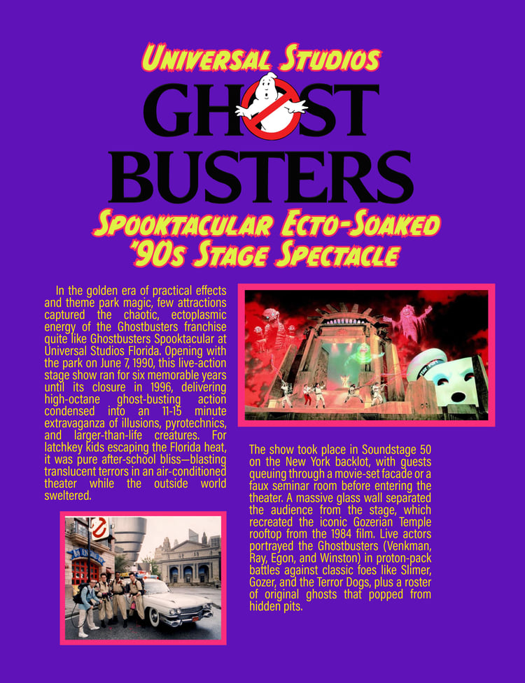 - Florida's Universal Studios Ghostbusters Spooktacular stage show – reliving the 90s park legend with its epic live effects showdown at the Temple of Gozer, Slimer pranks, proton streams, animatronic haunts, and that rooftop battle recreation that made every latchkey kid feel like a real Ghostbuster.