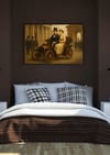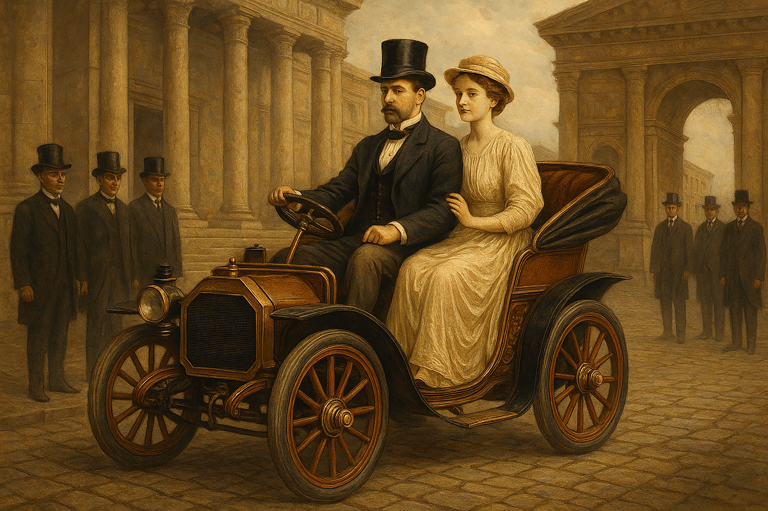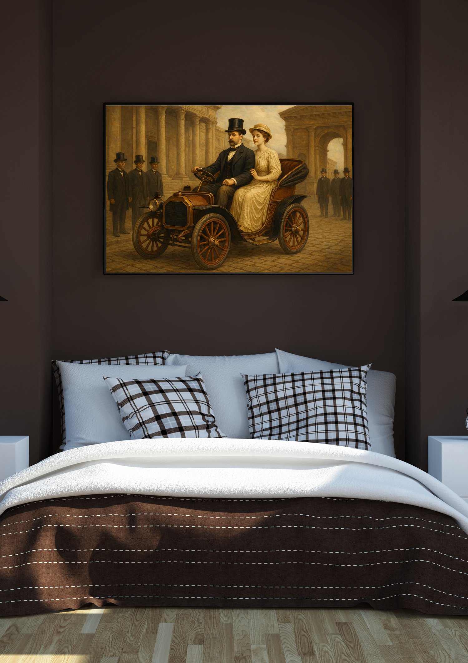 This digital painting portrays two of the richest individuals, seated calmly in an old classic car as they journey through a quiet city road, set in the nostalgic mood of the 1980s. Despite their wealth, their appearance is modest—no flashy accessories, just simple, clean clothing that reflects quiet confidence and contentment. The vintage car carries the character of the era with its worn leather seats and soft chrome details, blending into the muted, pastel cityscape glowing with soft neon signs and streetlights. The atmosphere is serene, not showy—suggesting that true richness lies not in display, but in presence, experience, and the quiet power of simplicity.