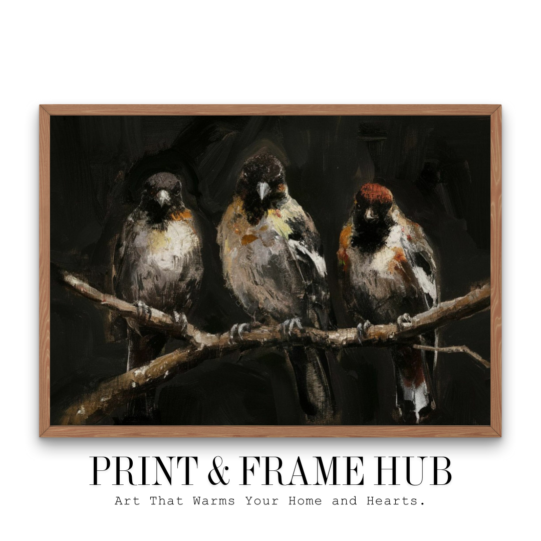 This captivating painting features three sparrows perched on a branch against a dark background. The artist's expressive brushwork and muted colors highlight each bird's unique character, creating a serene and intimate scene. Perfect for adding a touch of nature and tranquility to any home, this artwork brings warmth and charm to any room. Ideal for bird lovers and those who appreciate simple moments, it's a standout piece for any wall.