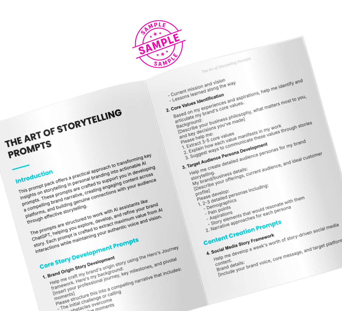 The prompts are structured to work with AI assistants like ChatGPT, helping you explore, develop, and refine your brand story. Each prompt is crafted to extract maximum value from AI interactions while maintaining your authentic voice and vision.